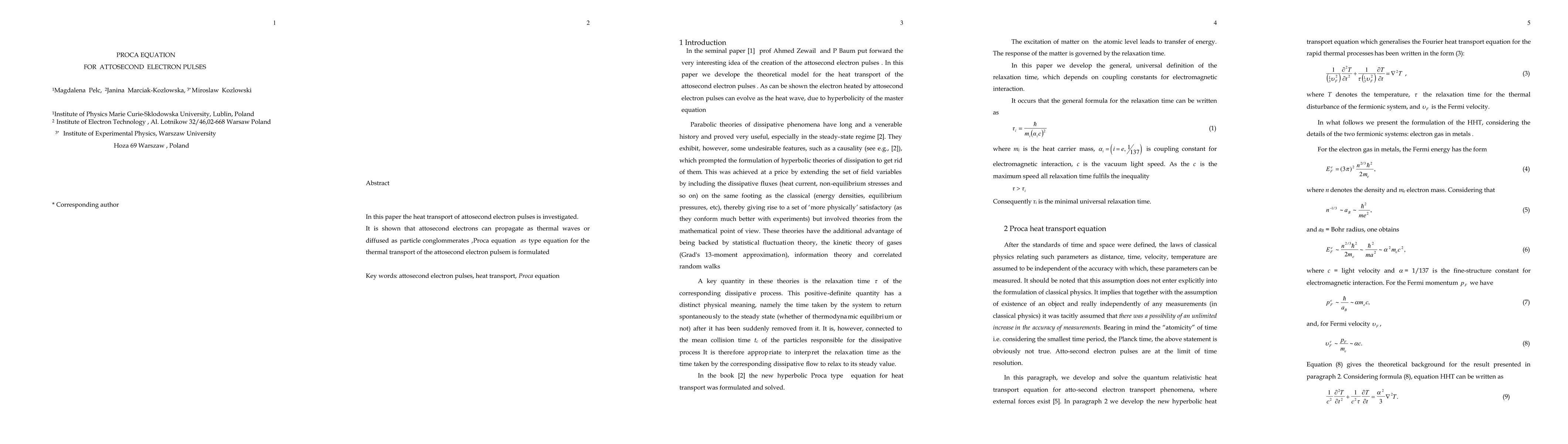 This paper investigates the heat transport of attosecond electron pulses, demonstrating their propagation as thermal waves or particle conglommerates, and formulates the Proca equation to describe their thermal transport dynamics.