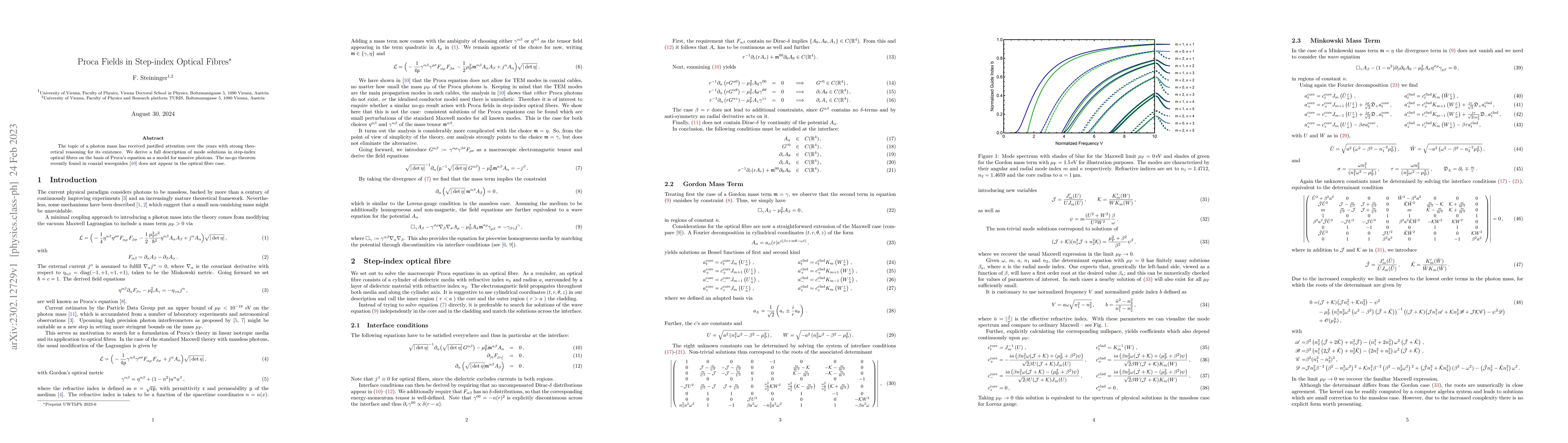 This paper explores the application of Proca's equation to describe mode solutions in step-index optical fibres, treating photons as if they have mass. It finds that, unlike coaxial waveguides, optical fibres do not exhibit the no-go theorem for massive photons.