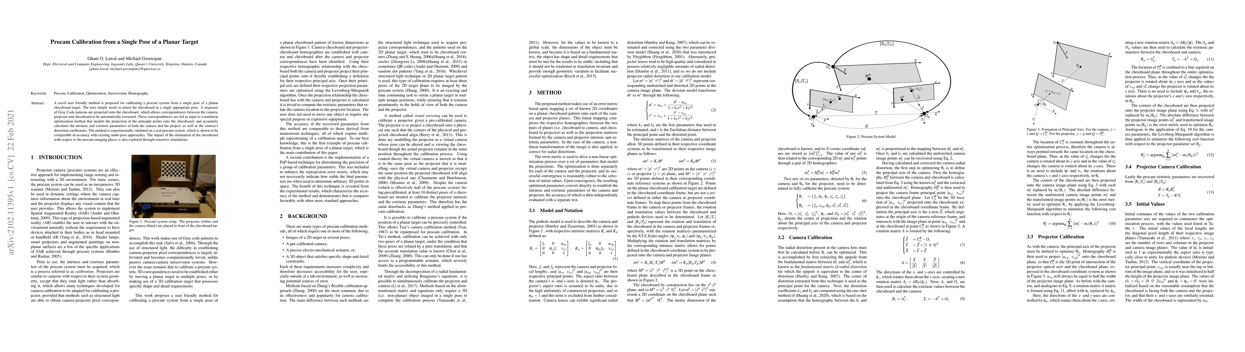 This paper proposes a novel method for calibrating a procam system using a single pose of a planar chessboard target, employing Gray Code patterns for automatic correspondence extraction and nonlinear optimization for parameter calculation. Experimental results show comparable accuracy to multi-pose methods.