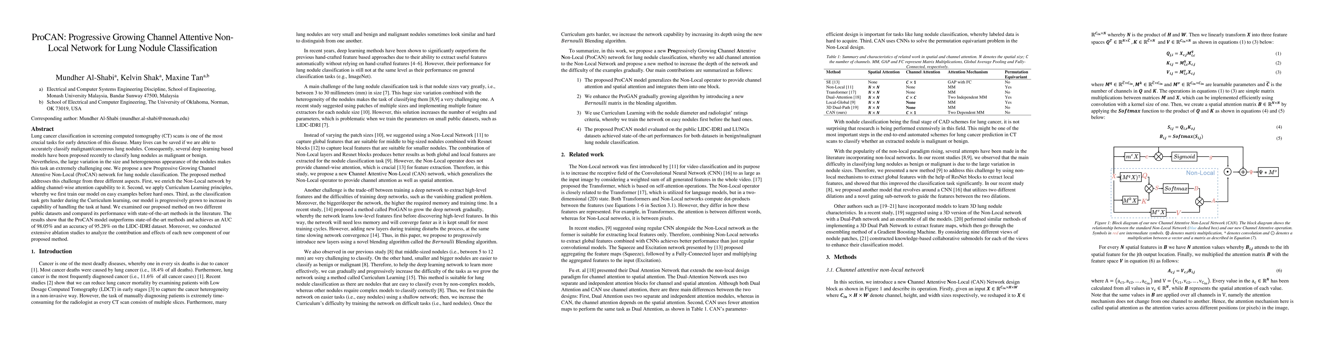 The ProCAN network enhances lung nodule classification in CT scans by integrating channel-wise attention, curriculum learning, and progressive growth, achieving superior performance with 98.05% AUC and 95.28% accuracy on the LIDC-IDRI dataset, outperforming existing methods. Ablation studies reveal the effectiveness of each component.