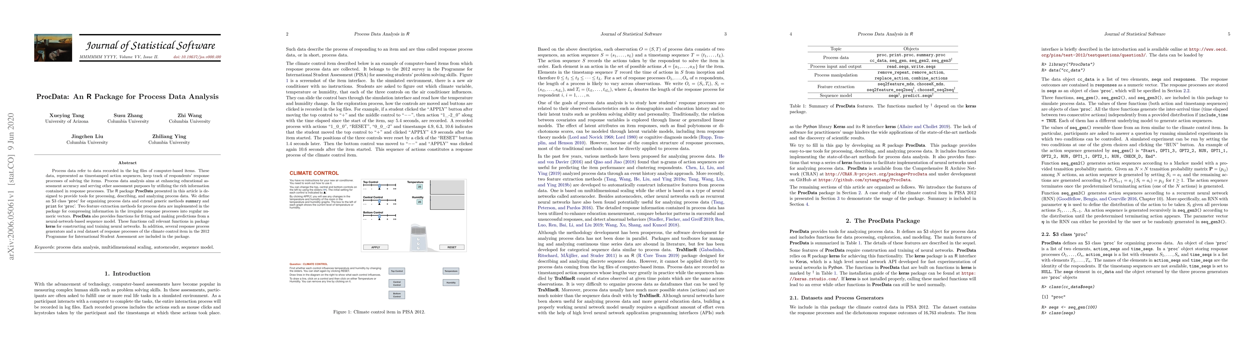 The R package ProcData offers tools for processing, describing, and analyzing process data from computer-based items, including methods for feature extraction and neural-network-based sequence modeling, and includes a real dataset for assessment. It also provides response process generators and an S3 class "proc" for data organization.