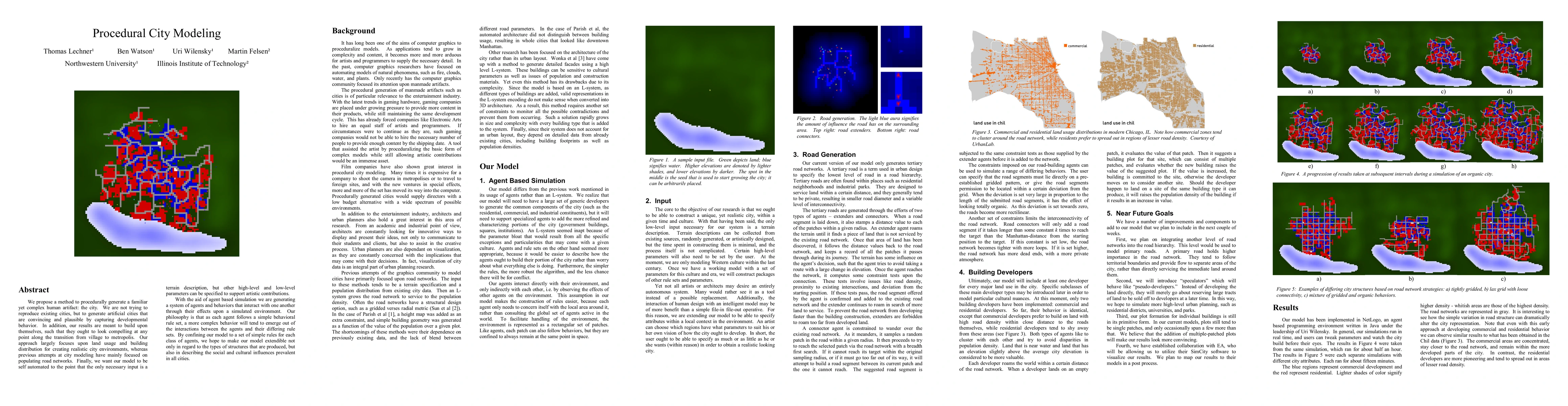 We propose a method to procedurally generate a familiar yet complex human artifact: the city. We are not trying to reproduce existing cities, but to generate artificial cities that are convincing and plausible by capturing developmental behavior. In addition, our results are meant to build upon themselves, such that they ought to look compelling at any point along the transition from village to metropolis. Our approach largely focuses upon land usage and building distribution for creating realistic city environments, whereas previous attempts at city modeling have mainly focused on populating road networks. Finally, we want our model to be self automated to the point that the only necessary input is a terrain description, but other high-level and low-level parameters can be specified to support artistic contributions. With the aid of agent based simulation we are generating a system of agents and behaviors that interact with one another through their effects upon a simulated environment. Our philosophy is that as each agent follows a simple behavioral rule set, a more complex behavior will tend to emerge out of the interactions between the agents and their differing rule sets. By confining our model to a set of simple rules for each class of agents, we hope to make our model extendible not only in regard to the types of structures that are produced, but also in describing the social and cultural influences prevalent in all cities