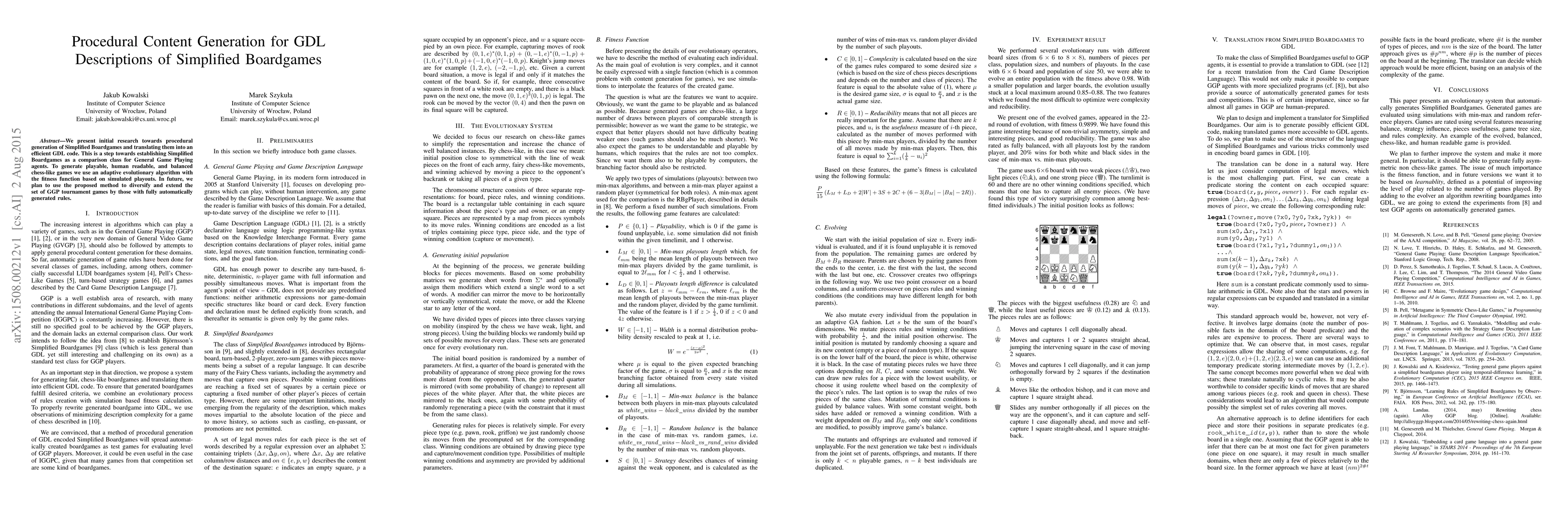 Researchers developed a method to generate playable chess-like games with balanced rules using an adaptive evolutionary algorithm. This approach aims to create a comparison class for General Game Playing agents.