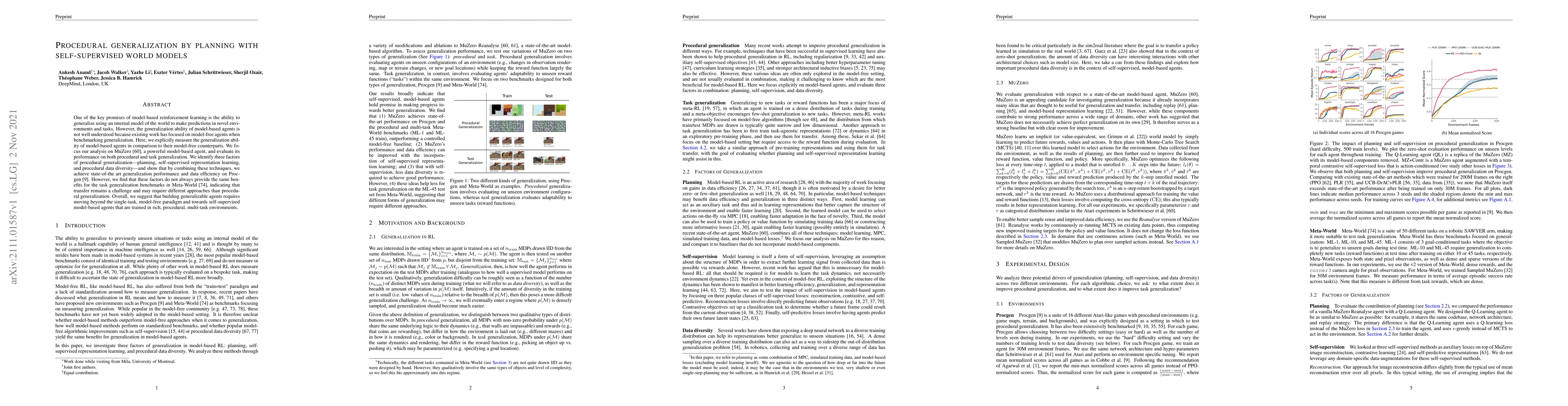 This paper investigates the generalization ability of model-based reinforcement learning agents, specifically MuZero, by analyzing procedural and task generalization. It identifies planning, self-supervised learning, and procedural data diversity as key factors for procedural generalization, achieving state-of-the-art performance. However, it finds that these factors do not equally benefit task generalization, highlighting the ongoing challenge of transfer learning.
