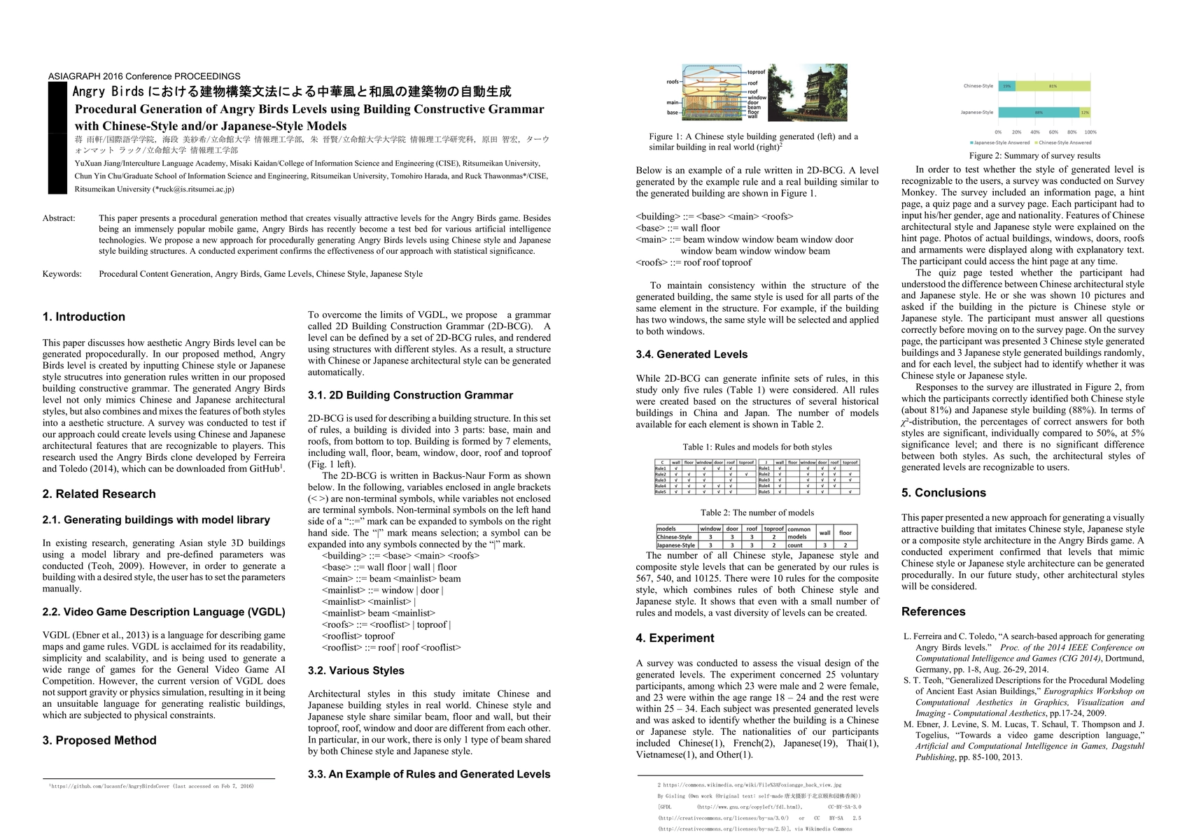 This paper introduces a procedural generation method for creating visually appealing Angry Birds levels using Chinese-style and Japanese-style building structures. Experimental results confirm the effectiveness of the proposed approach with statistical significance.