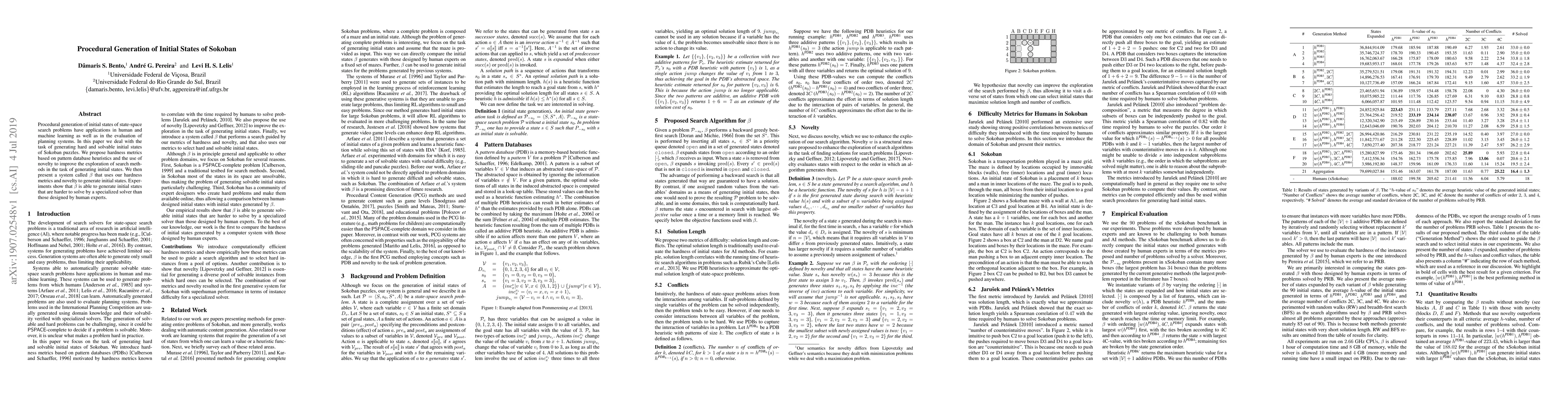 This paper proposes a method for procedurally generating hard and solvable initial states for Sokoban puzzles using hardness metrics and novelty. The system, Beta, successfully creates more challenging puzzles than those designed by human experts, demonstrating improved exploration of search methods.