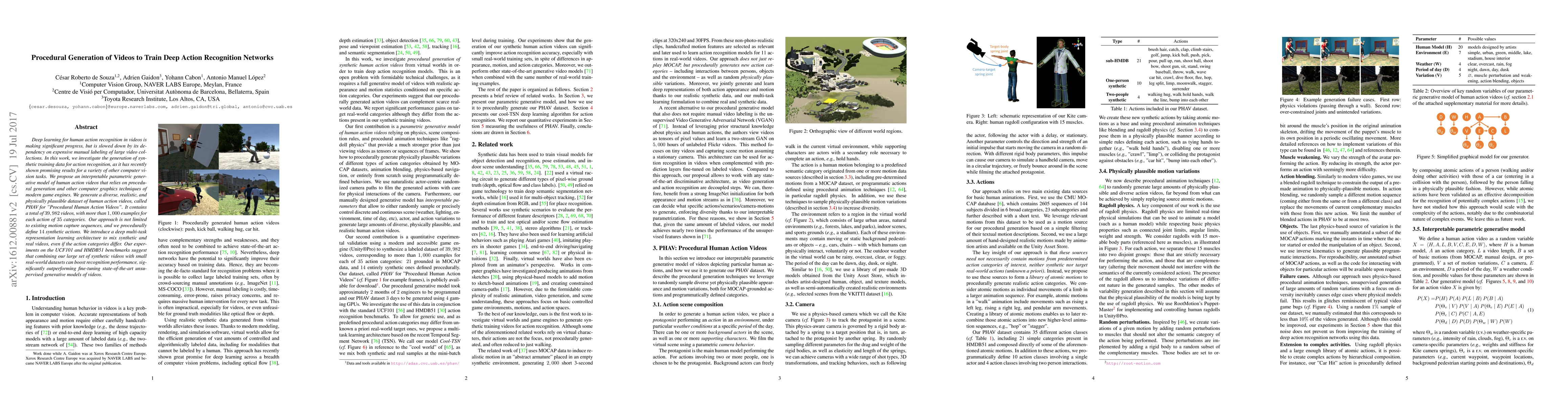 Deep learning for human action recognition in videos is making significant progress, but is slowed down by its dependency on expensive manual labeling of large video collections. In this work, we investigate the generation of synthetic training data for action recognition, as it has recently shown promising results for a variety of other computer vision tasks. We propose an interpretable parametric generative model of human action videos that relies on procedural generation and other computer graphics techniques of modern game engines. We generate a diverse, realistic, and physically plausible dataset of human action videos, called PHAV for "Procedural Human Action Videos". It contains a total of 39,982 videos, with more than 1,000 examples for each action of 35 categories. Our approach is not limited to existing motion capture sequences, and we procedurally define 14 synthetic actions. We introduce a deep multi-task representation learning architecture to mix synthetic and real videos, even if the action categories differ. Our experiments on the UCF101 and HMDB51 benchmarks suggest that combining our large set of synthetic videos with small real-world datasets can boost recognition performance, significantly outperforming fine-tuning state-of-the-art unsupervised generative models of videos.