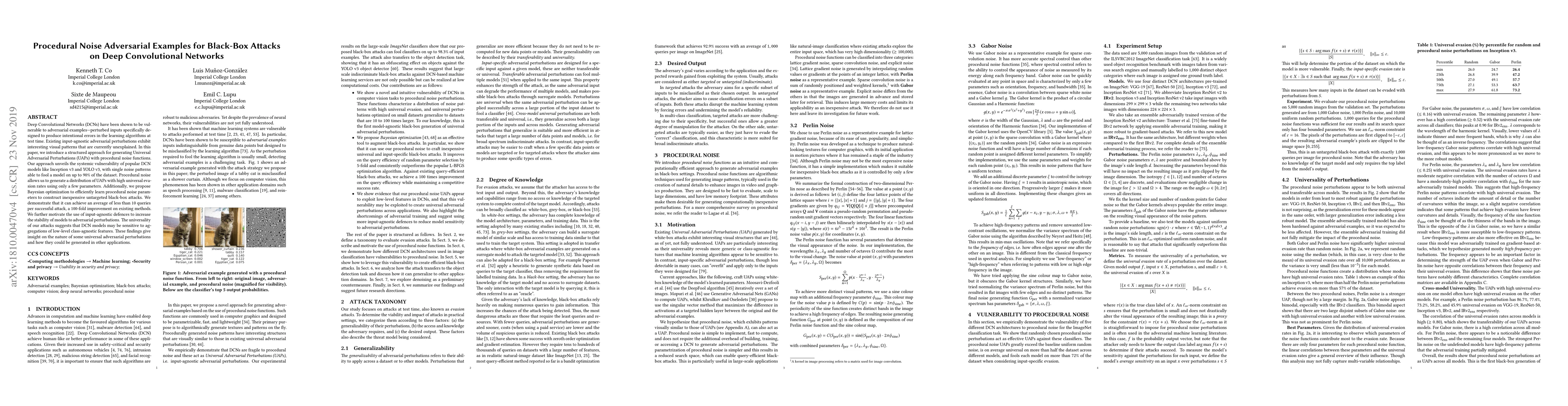 Deep Convolutional Networks (DCNs) have been shown to be vulnerable to adversarial examples---perturbed inputs specifically designed to produce intentional errors in the learning algorithms at test time. Existing input-agnostic adversarial perturbations exhibit interesting visual patterns that are currently unexplained. In this paper, we introduce a structured approach for generating Universal Adversarial Perturbations (UAPs) with procedural noise functions. Our approach unveils the systemic vulnerability of popular DCN models like Inception v3 and YOLO v3, with single noise patterns able to fool a model on up to 90% of the dataset. Procedural noise allows us to generate a distribution of UAPs with high universal evasion rates using only a few parameters. Additionally, we propose Bayesian optimization to efficiently learn procedural noise parameters to construct inexpensive untargeted black-box attacks. We demonstrate that it can achieve an average of less than 10 queries per successful attack, a 100-fold improvement on existing methods. We further motivate the use of input-agnostic defences to increase the stability of models to adversarial perturbations. The universality of our attacks suggests that DCN models may be sensitive to aggregations of low-level class-agnostic features. These findings give insight on the nature of some universal adversarial perturbations and how they could be generated in other applications.
