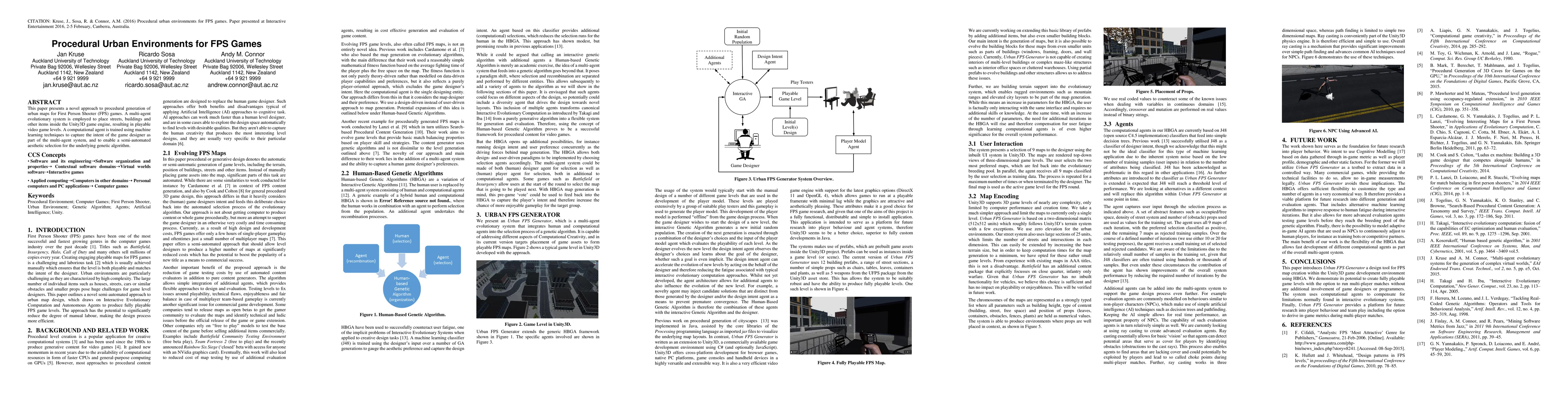 This paper introduces a multi-agent evolutionary system for procedurally generating urban maps in FPS games within Unity3D, utilizing machine learning to capture the game designer's intent and semi-automate the aesthetic selection for the genetic algorithm.