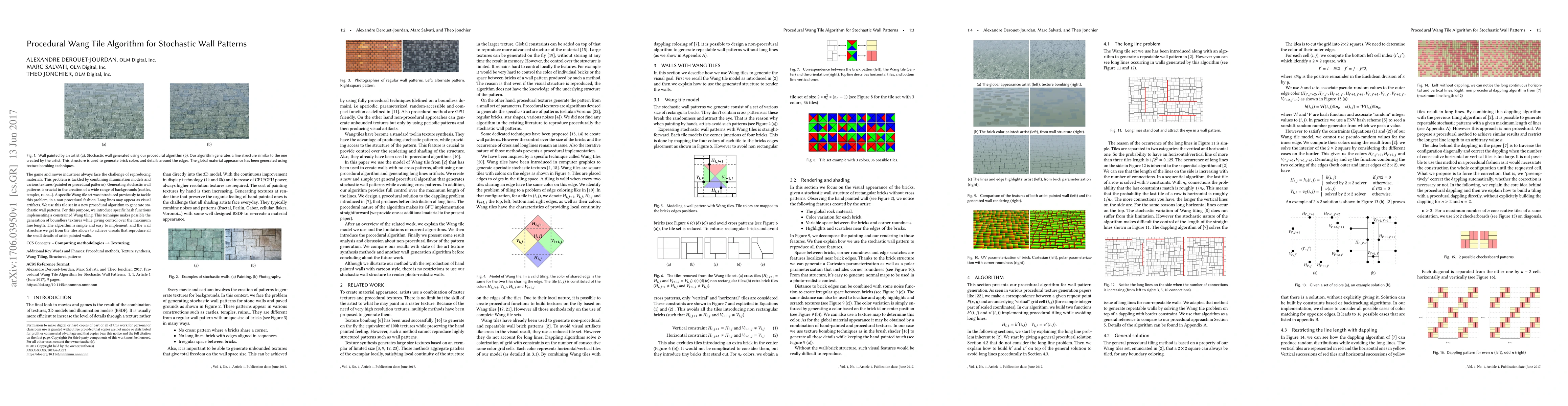 This paper presents a procedural Wang tile algorithm for generating stochastic wall patterns, using hash functions to control line length and avoid visual artifacts, enabling the creation of detailed, boundless textures for game and movie backgrounds.
