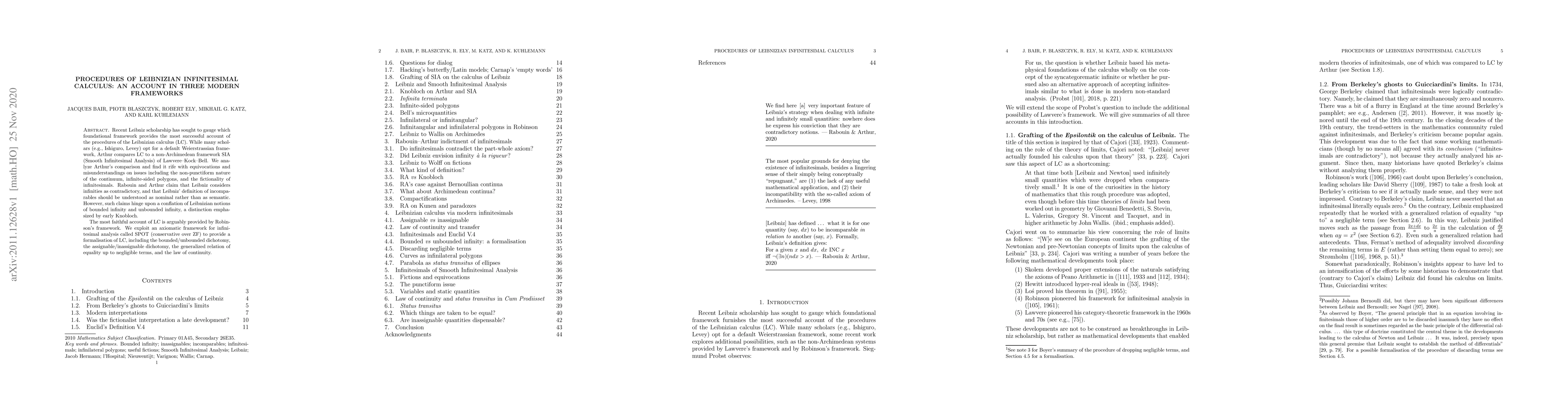Recent Leibniz scholarship has sought to gauge which foundational framework provides the most successful account of the procedures of the Leibnizian calculus (LC). While many scholars (e.g., Ishiguro, Levey) opt for a default Weierstrassian framework, Arthur compares LC to a non-Archimedean framework SIA (Smooth Infinitesimal Analysis) of Lawvere-Kock-Bell. We analyze Arthur's comparison and find it rife with equivocations and misunderstandings on issues including the non-punctiform nature of the continuum, infinite-sided polygons, and the fictionality of infinitesimals. Rabouin and Arthur claim that Leibniz considers infinities as contradictory, and that Leibniz' definition of incomparables should be understood as nominal rather than as semantic. However, such claims hinge upon a conflation of Leibnizian notions of bounded infinity and unbounded infinity, a distinction emphasized by early Knobloch. The most faithful account of LC is arguably provided by Robinson's framework. We exploit an axiomatic framework for infinitesimal analysis called SPOT (conservative over ZF) to provide a formalisation of LC, including the bounded/unbounded dichotomy, the assignable/inassignable dichotomy, the generalized relation of equality up to negligible terms, and the law of continuity.