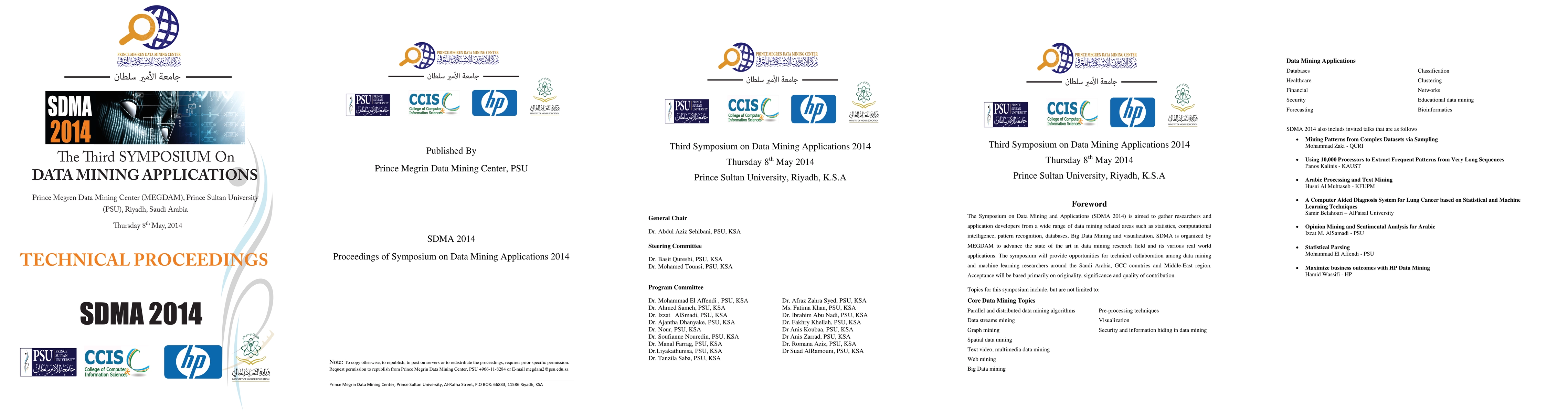 The Symposium on Data Mining and Applications (SDMA 2014) is aimed to gather researchers and application developers from a wide range of data mining related areas such as statistics, computational intelligence, pattern recognition, databases, Big Data Mining and visualization. SDMA is organized by MEGDAM to advance the state of the art in data mining research field and its various real world applications. The symposium will provide opportunities for technical collaboration among data mining and machine learning researchers around the Saudi Arabia, GCC countries and Middle-East region. Acceptance will be based primarily on originality, significance and quality of contribution.