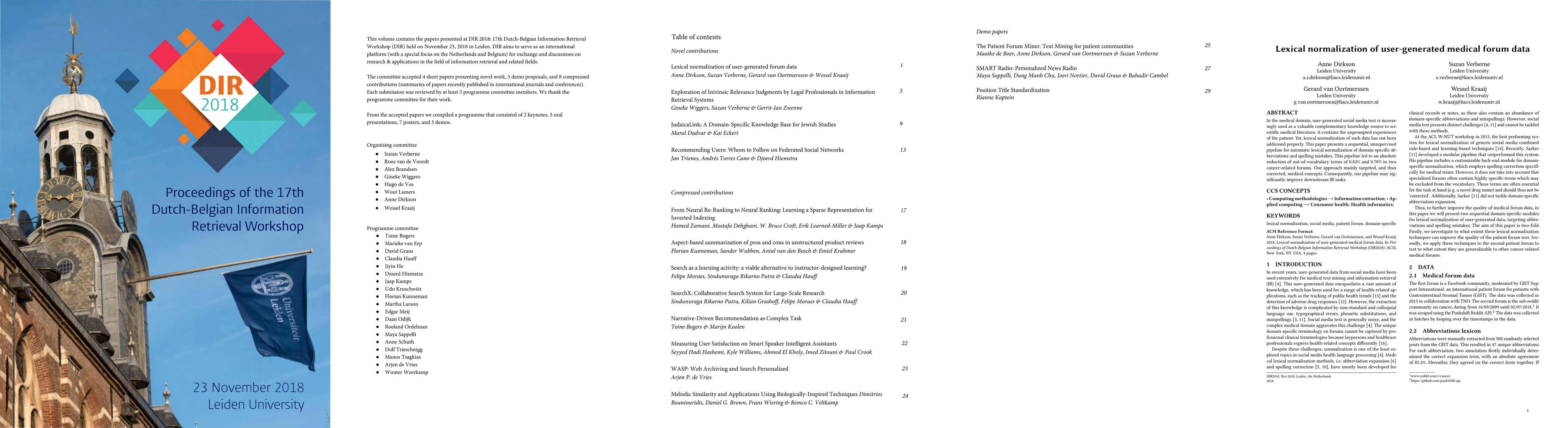 This volume contains the papers presented at DIR 2018: 17th Dutch-Belgian Information Retrieval Workshop (DIR) held on November 23, 2018 in Leiden. DIR aims to serve as an international platform (with a special focus on the Netherlands and Belgium) for exchange and discussions on research & applications in the field of information retrieval and related fields. The committee accepted 4 short papers presenting novel work, 3 demo proposals, and 8 compressed contributions (summaries of papers recently published in international journals and conferences). Each submission was reviewed by at least 3 programme committee members.