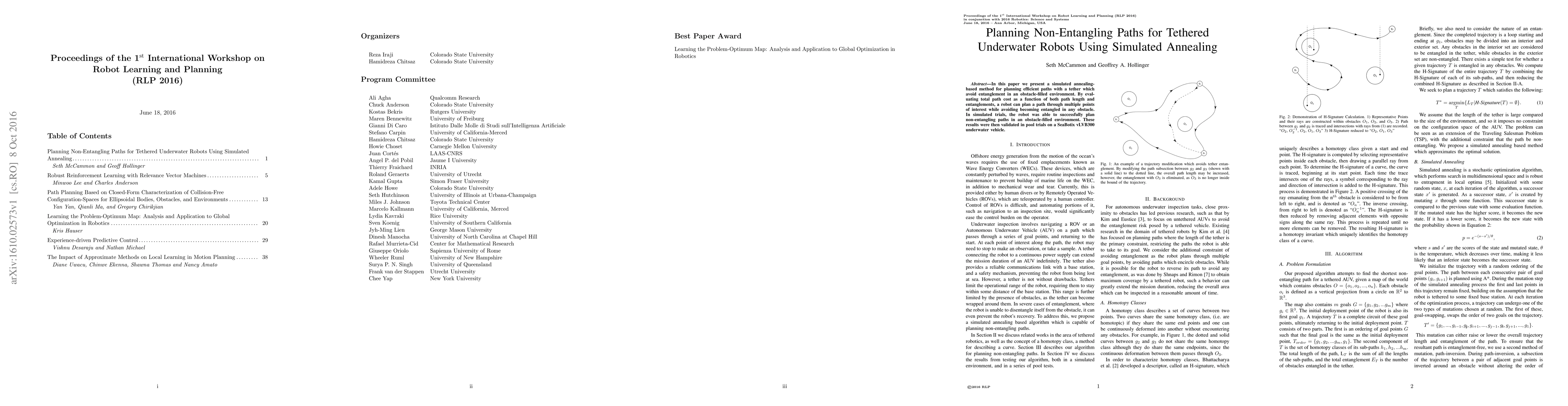 This volume compiles the proceedings from the 1st International Workshop on Robot Learning and Planning (RLP 2016), featuring research on advanced methods in robot learning and planning, fostering innovation in autonomous systems. Contributions explore novel algorithms and applications enhancing robot autonomy and decision-making capabilities.