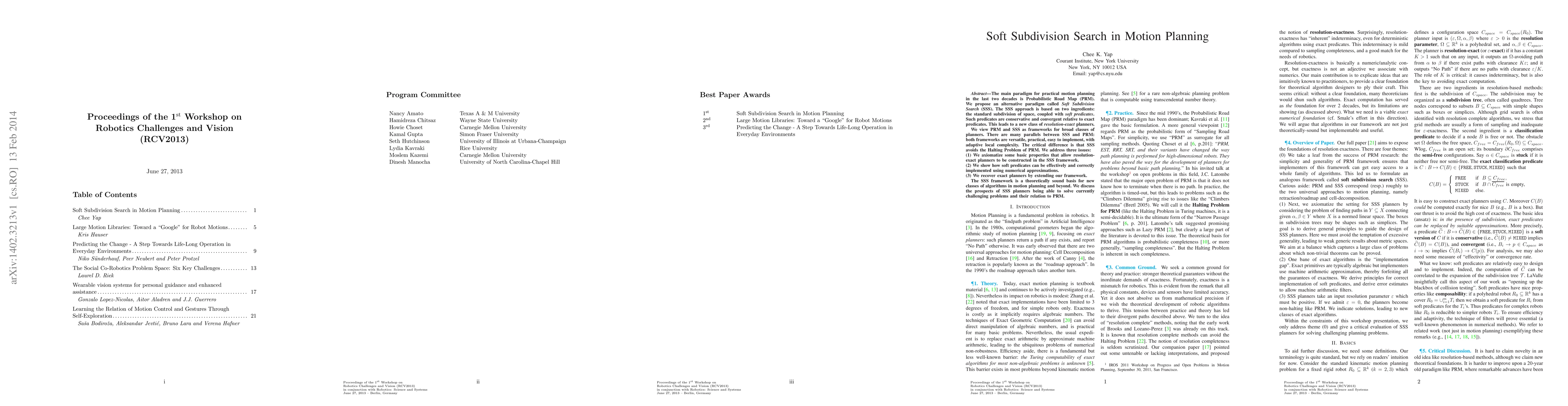 This paper summarizes the proceedings of the 1st Workshop on Robotics Challenges and Vision (RCV2013), highlighting key discussions and challenges faced in the field of robotics and vision technologies. The workshop aimed to foster innovation and collaboration among researchers in these domains.