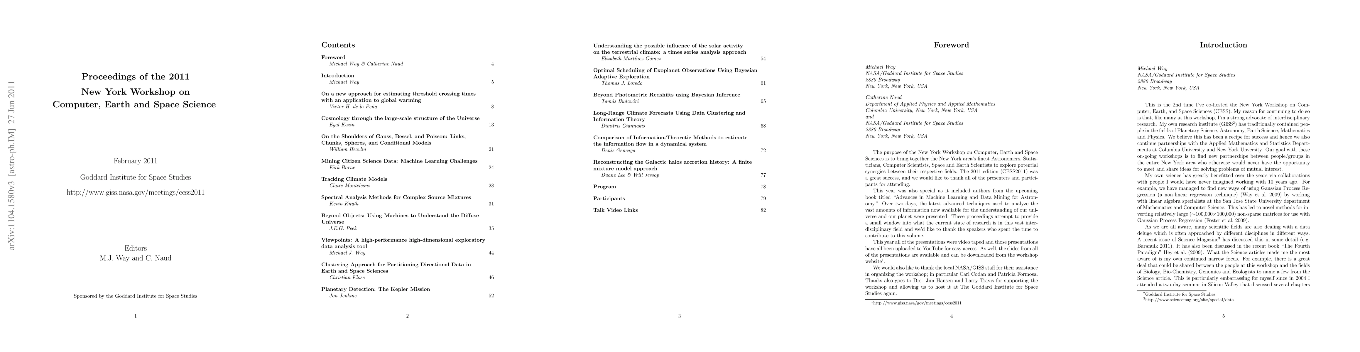 The purpose of the New York Workshop on Computer, Earth and Space Sciences is to bring together the New York area's finest Astronomers, Statisticians, Computer Scientists, Space and Earth Scientists to explore potential synergies between their respective fields. The 2011 edition (CESS2011) was a great success, and we would like to thank all of the presenters and participants for attending. This year was also special as it included authors from the upcoming book titled "Advances in Machine Learning and Data Mining for Astronomy". Over two days, the latest advanced techniques used to analyze the vast amounts of information now available for the understanding of our universe and our planet were presented. These proceedings attempt to provide a small window into what the current state of research is in this vast interdisciplinary field and we'd like to thank the speakers who spent the time to contribute to this volume.