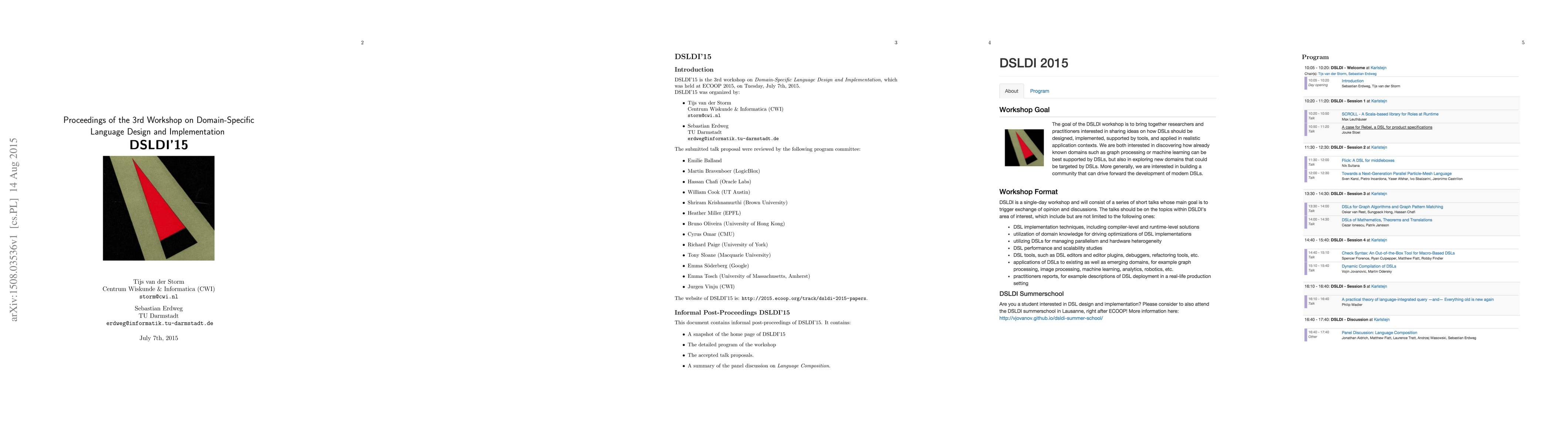 The goal of the DSLDI workshop is to bring together researchers and practitioners interested in sharing ideas on how DSLs should be designed, implemented, supported by tools, and applied in realistic application contexts. We are both interested in discovering how already known domains such as graph processing or machine learning can be best supported by DSLs, but also in exploring new domains that could be targeted by DSLs. More generally, we are interested in building a community that can drive forward the development of modern DSLs. These informal post-proceedings contain the submitted talk abstracts to the 3rd DSLDI workshop (DSLDI'15), and a summary of the panel discussion on Language Composition.
