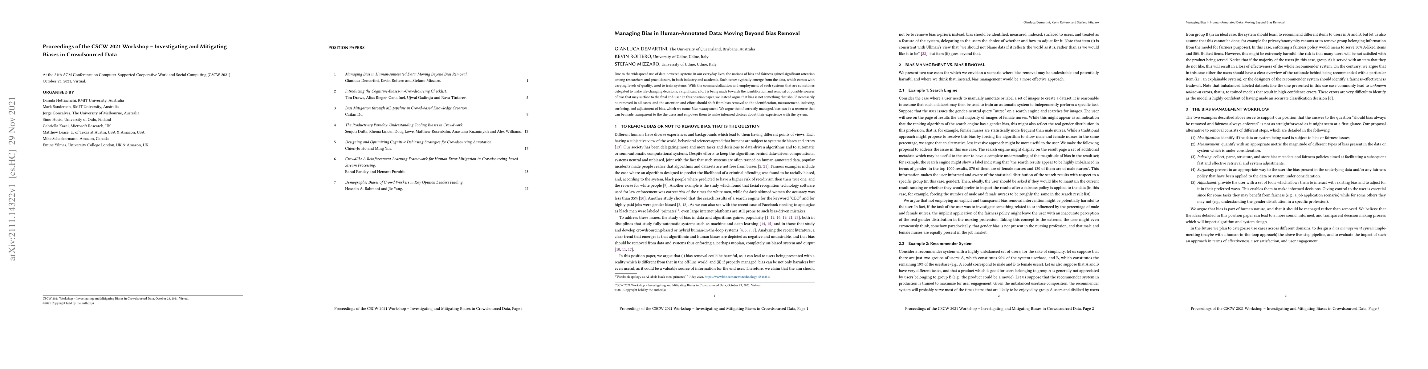 The CSCW 2021 workshop explored biases in crowdsourced data, identifying contributions from workflows, worker attributes, and practices. It discussed research directions for mitigating labelling biases and their implications for crowd workers.