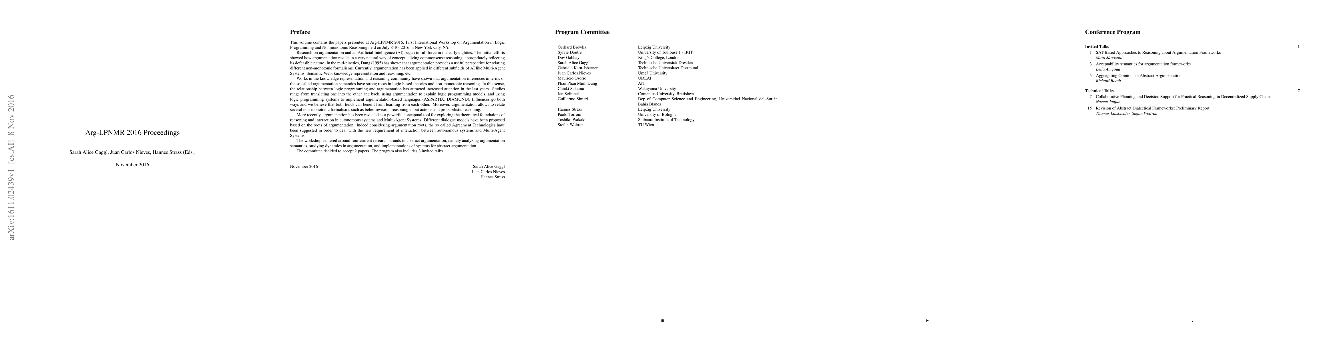This volume compiles the papers from the Arg-LPNMR 2016 workshop, focusing on argumentation within logic programming and non-monotonic reasoning, held in New York City. The papers explore advanced methodologies and applications in these fields.