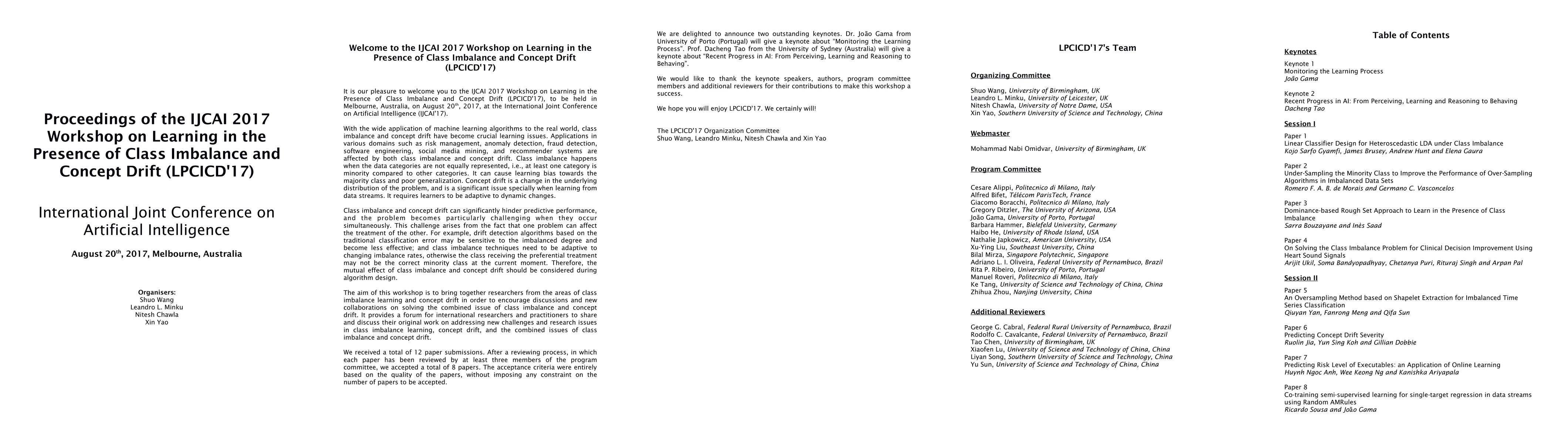 With the wide application of machine learning algorithms to the real world, class imbalance and concept drift have become crucial learning issues. Class imbalance happens when the data categories are not equally represented, i.e., at least one category is minority compared to other categories. It can cause learning bias towards the majority class and poor generalization. Concept drift is a change in the underlying distribution of the problem, and is a significant issue specially when learning from data streams. It requires learners to be adaptive to dynamic changes. Class imbalance and concept drift can significantly hinder predictive performance, and the problem becomes particularly challenging when they occur simultaneously. This challenge arises from the fact that one problem can affect the treatment of the other. For example, drift detection algorithms based on the traditional classification error may be sensitive to the imbalanced degree and become less effective; and class imbalance techniques need to be adaptive to changing imbalance rates, otherwise the class receiving the preferential treatment may not be the correct minority class at the current moment. Therefore, the mutual effect of class imbalance and concept drift should be considered during algorithm design. The aim of this workshop is to bring together researchers from the areas of class imbalance learning and concept drift in order to encourage discussions and new collaborations on solving the combined issue of class imbalance and concept drift. It provides a forum for international researchers and practitioners to share and discuss their original work on addressing new challenges and research issues in class imbalance learning, concept drift, and the combined issues of class imbalance and concept drift. The proceedings include 8 papers on these topics.