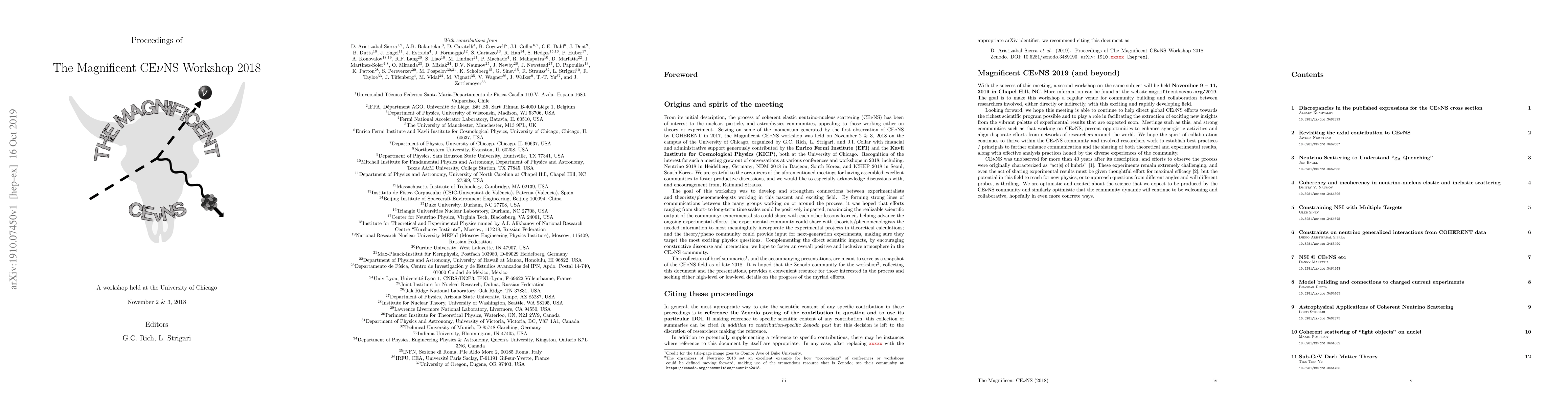 The Magnificent CE$\nu$NS Workshop (2018) was held November 2 & 3 of 2018 on the University of Chicago campus and brought together theorists, phenomenologists, and experimentalists working in numerous areas but sharing a common interest in the process of coherent elastic neutrino-nucleus scattering (CE$\nu$NS). This is a collection of abstract-like summaries of the talks given at the meeting, including links to the slides presented. This document and the slides from the meeting provide an overview of the field and a snapshot of the robust CE$\nu$NS-related efforts both planned and underway.