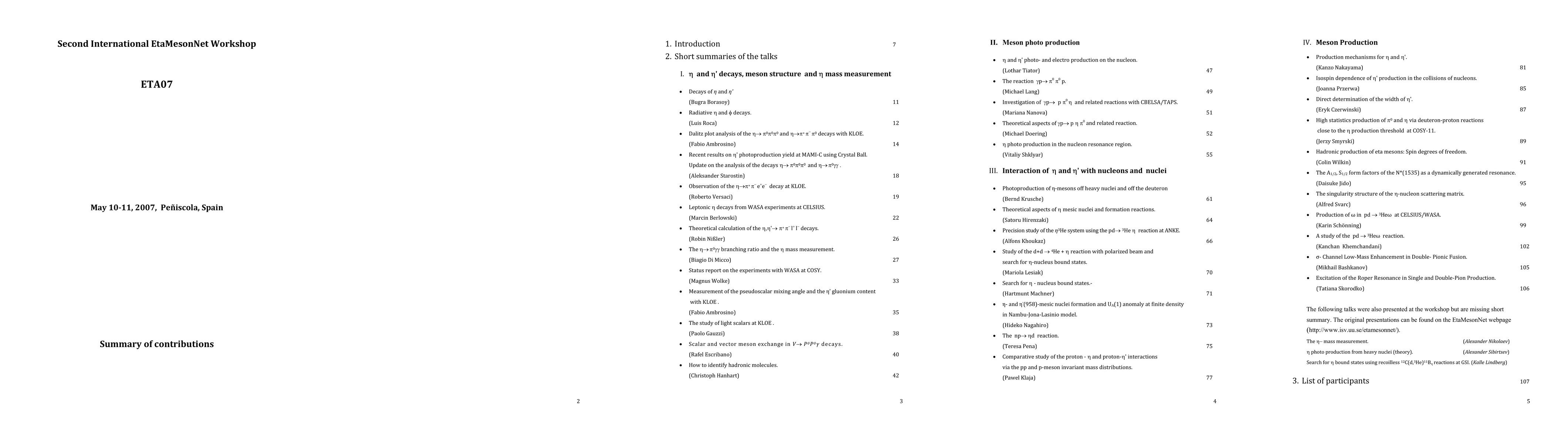 These are the proceedings of the Second International Workshop on Eta Meson Physics held in May 10-11, 2007, at the resort Peniscola in Spain. The workshop was focused on topics regarding eta and eta' -meson production and decays physics of common interest in the EU EtaMesonNet network.
