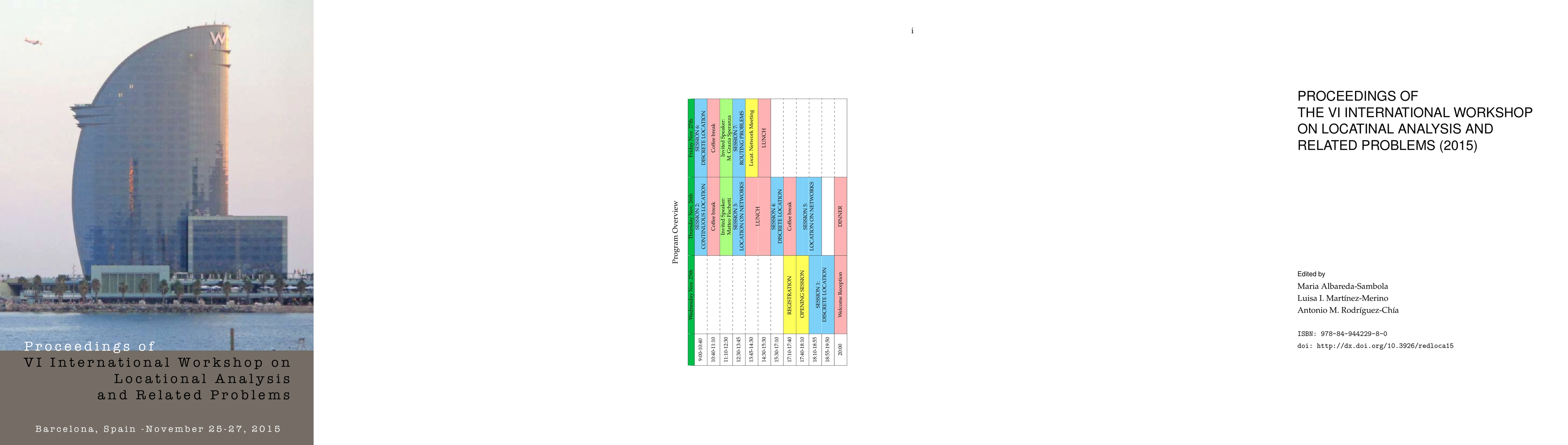 The International Workshop on Locational Analysis and Related Problems will take place during November 25-27, 2015 in Barcelona (Spain). It is organized by the Spanish Location Network and Location Group GELOCA (SEIO). GELOCA is a working group on location belonging to the Statistics and Operations Research Spanish Society. The Spanish Location Network is a group of more than 140 researchers distributed into 16 nodes corresponding to several Spanish universities. The Network has been funded by the Spanish Government. Every year, the Network organizes a meeting to promote the communication among its members and between them and other researchers, and to contribute to the development of the location field and related problems. Previous meetings took place in Sevilla (October 1-3, 2014), Torremolinos (M\'alaga, June 19-21, 2013), Granada (May 10-12, 2012), Las Palmas de Gran Canaria (February 2-5, 2011) and Sevilla (February 1-3, 2010). The topics of interest are location analysis and related problems. This includes location, routing, networks, transportation and logistics models; exact and heuristic solution methods, and computational geometry, among others.