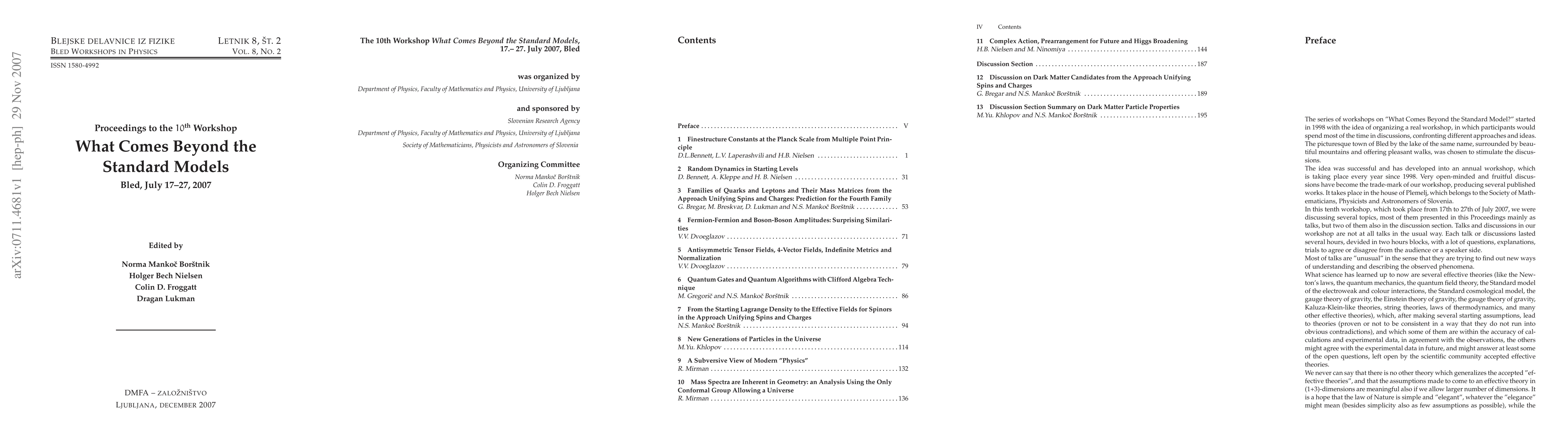 Contents: 1. Finestructure Constants at the Planck Scale from Multiple Point Principle (D.L.Bennett, L.V. Laperashvili and H.B. Nielsen) 2. Random Dynamics in Starting Levels (D. Bennett, A. Kleppe in H.B. Nielsen), 3. Families of Quarks and Leptons and Their Mass Matrices from the Approach Unifying Spins and Charges: Prediction for the Fourth Family (G. Bregar, M. Breskvar, D. Lukman and N.S. Mankoc Borstnik) 4. Fermion-Fermion and Boson-Boson Amplitudes: Surprising Similarities (V.V. Dvoeglazov) 5. Antisymmetric Tensor Fields, 4-Vector Fields, Indefinite Metrics and Normalization (V.V. Dvoeglazov) 6. Quantum Gates and Quantum Algorithms with Clifford Algebra Technique (M. Gregoric and N.S. Mankoc Borstnik) 7. From the Starting Lagrange Density to the Effective Fields for Spinors in the Approach Unifying Spins and Charges (N.S. Mankoc Borstnik) 8. New Generations of Particles in the Universe (M.Yu. Khlopov) 9. A Subversive View of Modern 'Physics' (R. Mirman) 10. Mass Spectra are Inherent in Geometry: an Analysis Using the Only Conformal Group Allowing a Universe (R. Mirman) 11. Complex Action, Prearrangement for Future and Higgs Broadening (H.B. Nielsen and M. Ninomiya) 12. Discussion on Dark Matter Candidates from the Approach Unifying Spins and Charges (G. Bregar and N.S. Mankoc Borstnik) 13. Discussion Section Summary on Dark Matter Particle Properties (M.Yu. Khlopov and N.S. Mankoc Borstnik)