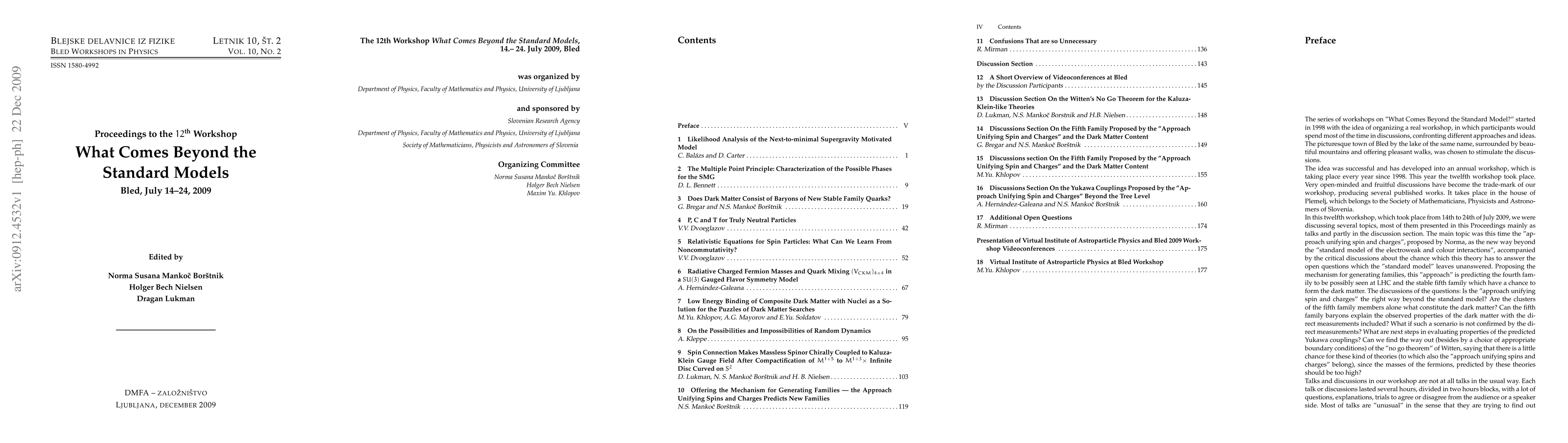 Contents: 1. Likelihood Analysis of the Next-to-minimal Supergravity Motivated Model (C. Balazs and D. Carter) 2. The Multiple Point Principle: Characterization of the Possible Phases for the SMG (D.L. Bennett) 3. Does Dark Matter Consist of Baryons of New Stable Family Quarks? (G. Bregar and N.S. Mankoc Borstnik) 4. P, C and T for Truly Neutral Particles (V.V. Dvoeglazov) 5. Relativistic Equations for Spin Particles: What Can We Learn From Noncommutativity? (V.V. Dvoeglazov) 6. Radiative Charged Fermion Masses and Quark Mixing (VCKM)4x4 in a SU(3) Gauged Flavor Symmetry Model (A. Hernandez-Galeana) 7. Low Energy Binding of Composite Dark Matter with Nuclei as a Solution for the Puzzles of Dark Matter Searches (M.Yu. Khlopov, A.G. Mayorov and E.Yu. Soldatov) 8. On the Possibilities and Impossibilities of Random Dynamics (A. Kleppe) 9. Spin Connection Makes Massless Spinor Chirally Coupled to Kaluza-Klein Gauge Field After Compactification of $M^{1+5}$ to $M^{1+3}$ x Infinite Disc Curved on $S^2$ (D. Lukman, N.S. Mankoc Borstnik and H.B. Nielsen) 10. Offering the Mechanism for Generating Families - the Approach Unifying Spins and Charges Predicts New Families (N.S. Mankoc Borstnik) 11. Confusions That are so Unnecessary (R. Mirman) 12. - 17. Discussion Sections 18. Presentation of VIA and Bled 2009 Workshop Videoconferences (M.Yu. Khlopov)