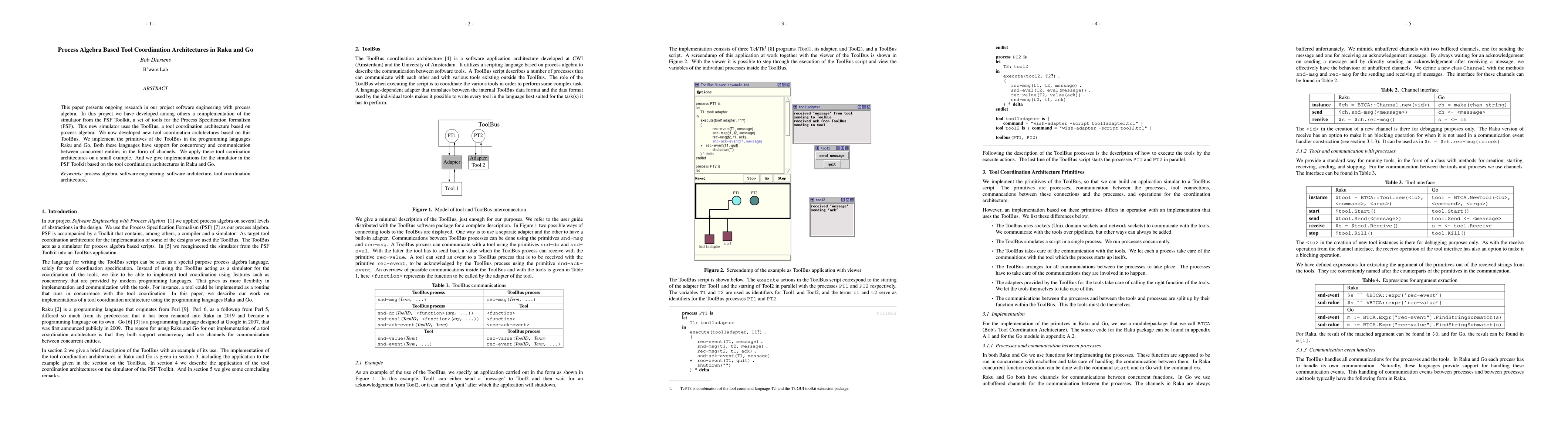 This paper presents ongoing research in our project software engineering with process algebra. In this project we have developed among others a reimplementation of the simulator from the PSF Toolkit, a set of tools for the Process Specification formalism (PSF). This new simulator uses the ToolBus, a tool coordination architecture based on process algebra. We now developed new tool coordination architectures based on this ToolBus. We implement the primitives of the ToolBus in the programming languages Raku and Go. Both these languages have support for concurrency and communication between concurrent entities in the form of channels. We apply these tool coorination architectures on a small example. And we give implementations for the simulator in the PSF Toolkit based on the tool coordination architectures in Raku and Go.