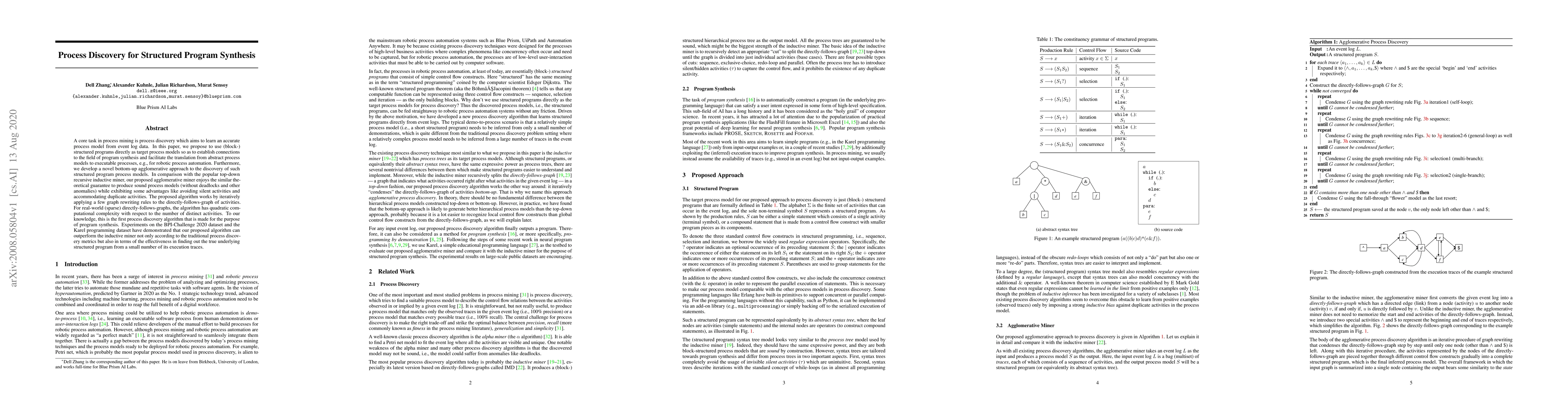 A core task in process mining is process discovery which aims to learn an accurate process model from event log data. In this paper, we propose to use (block-) structured programs directly as target process models so as to establish connections to the field of program synthesis and facilitate the translation from abstract process models to executable processes, e.g., for robotic process automation. Furthermore, we develop a novel bottom-up agglomerative approach to the discovery of such structured program process models. In comparison with the popular top-down recursive inductive miner, our proposed agglomerative miner enjoys the similar theoretical guarantee to produce sound process models (without deadlocks and other anomalies) while exhibiting some advantages like avoiding silent activities and accommodating duplicate activities. The proposed algorithm works by iteratively applying a few graph rewriting rules to the directly-follows-graph of activities. For real-world (sparse) directly-follows-graphs, the algorithm has quadratic computational complexity with respect to the number of distinct activities. To our knowledge, this is the first process discovery algorithm that is made for the purpose of program synthesis. Experiments on the BPI-Challenge 2020 dataset and the Karel programming dataset have demonstrated that our proposed algorithm can outperform the inductive miner not only according to the traditional process discovery metrics but also in terms of the effectiveness in finding out the true underlying structured program from a small number of its execution traces.