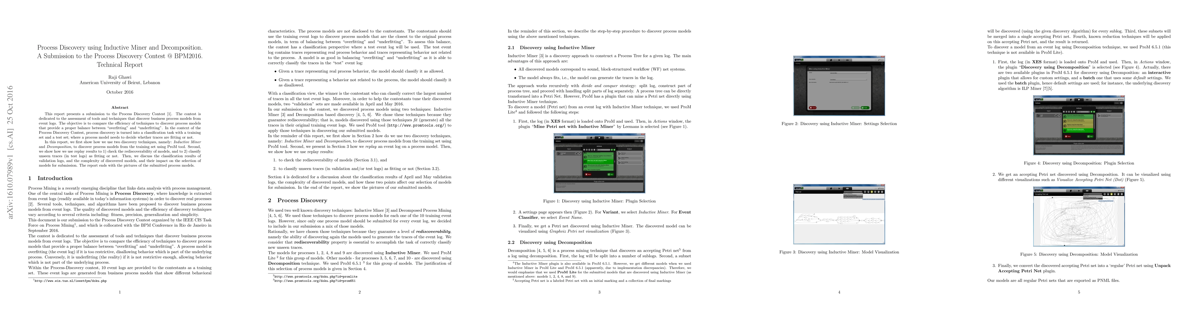 This report presents a submission to the Process Discovery Contest. The contest is dedicated to the assessment of tools and techniques that discover business process models from event logs. The objective is to compare the efficiency of techniques to discover process models that provide a proper balance between "overfitting" and "underfitting". In the context of the Process Discovery Contest, process discovery is turned into a classification task with a training set and a test set; where a process model needs to decide whether traces are fitting or not. In this report, we first show how we use two discovery techniques, namely: Inductive Miner and Decomposition, to discover process models from the training set using ProM tool. Second, we show how we use replay results to 1) check the rediscoverability of models, and to 2) classify unseen traces (in test logs) as fitting or not. Then, we discuss the classification results of validation logs, the complexity of discovered models, and their impact on the selection of models for submission. The report ends with the pictures of the submitted process models.