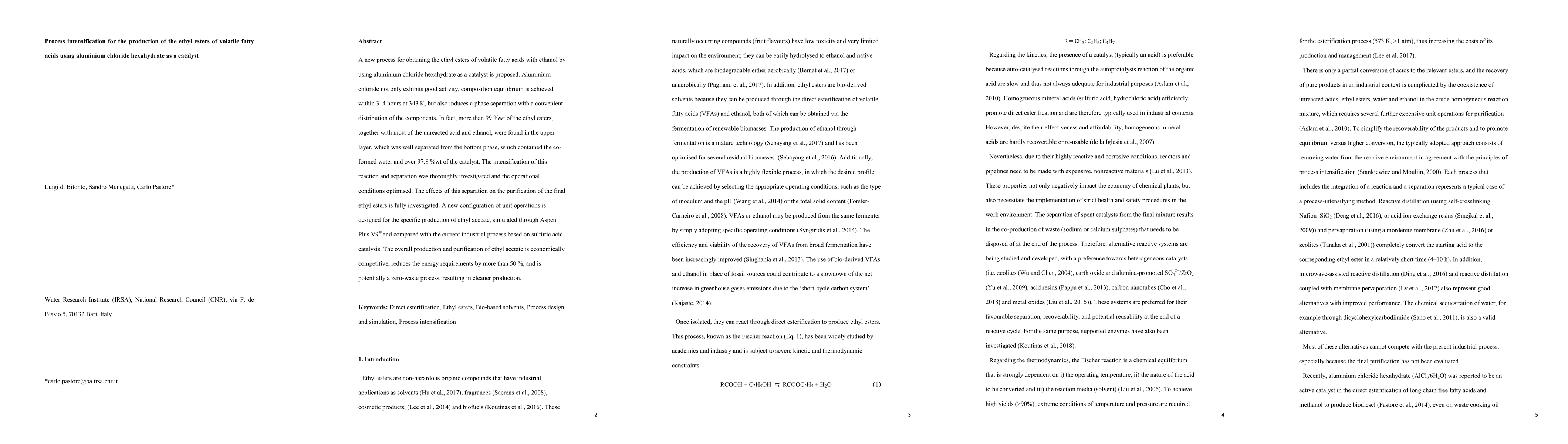 This paper proposes a new process for producing ethyl esters of volatile fatty acids using aluminium chloride hexahydrate as a catalyst, achieving high yields and phase separation within 4 hours at 343 K. The new method is economically competitive, reduces energy use by over 50%, and offers potential for zero waste, cleaner production compared to traditional sulfuric acid catalysis.