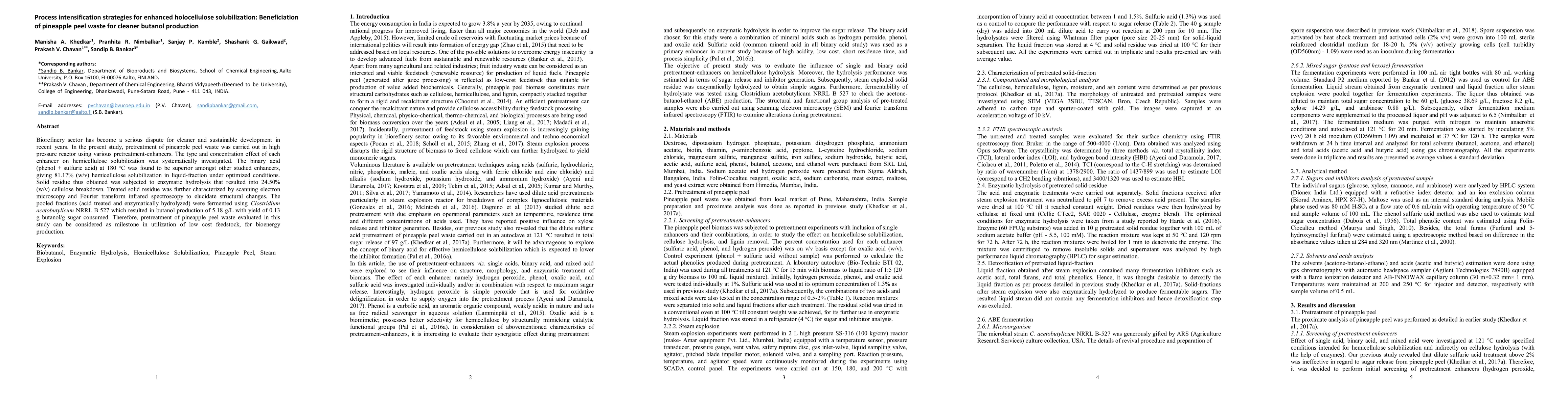 This study investigates process intensification strategies for solubilizing holocellulose from pineapple peel waste, optimizing pretreatment with binary acid (phenol + sulfuric acid) to enhance hemicellulose solubilization and facilitate enzymatic hydrolysis for butanol production, achieving a yield of 0.13 g butanol/g sugar consumed.