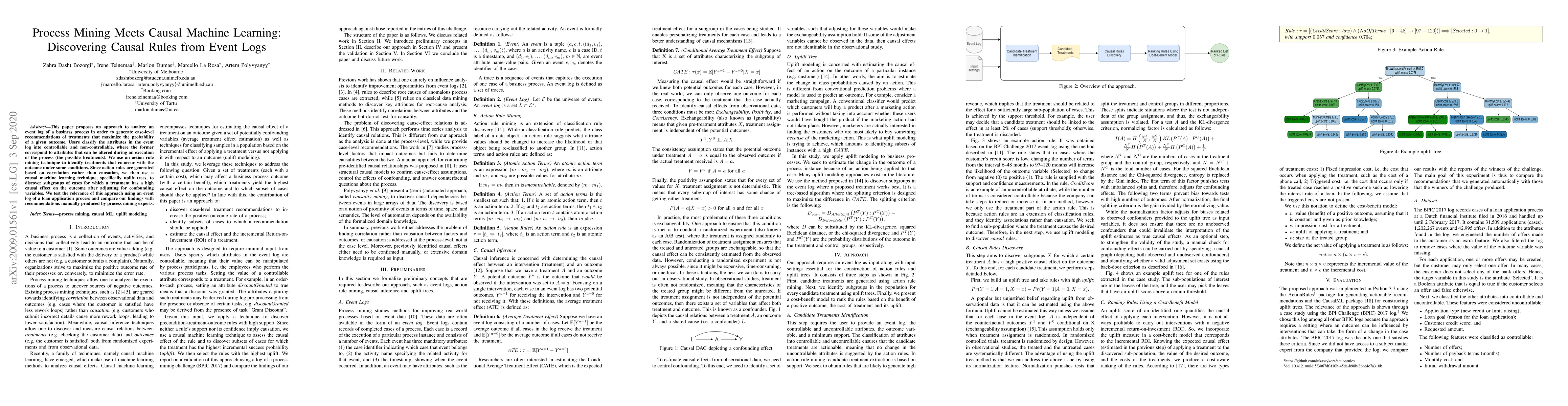 This paper proposes a method to analyze event logs of business processes using process mining and causal machine learning to discover case-level recommendations for treatments that maximize the probability of a given outcome. The approach identifies correlations between controllable attributes and outcomes, then uses uplift trees to adjust for confounding variables and determine high-causal effect subgroups.