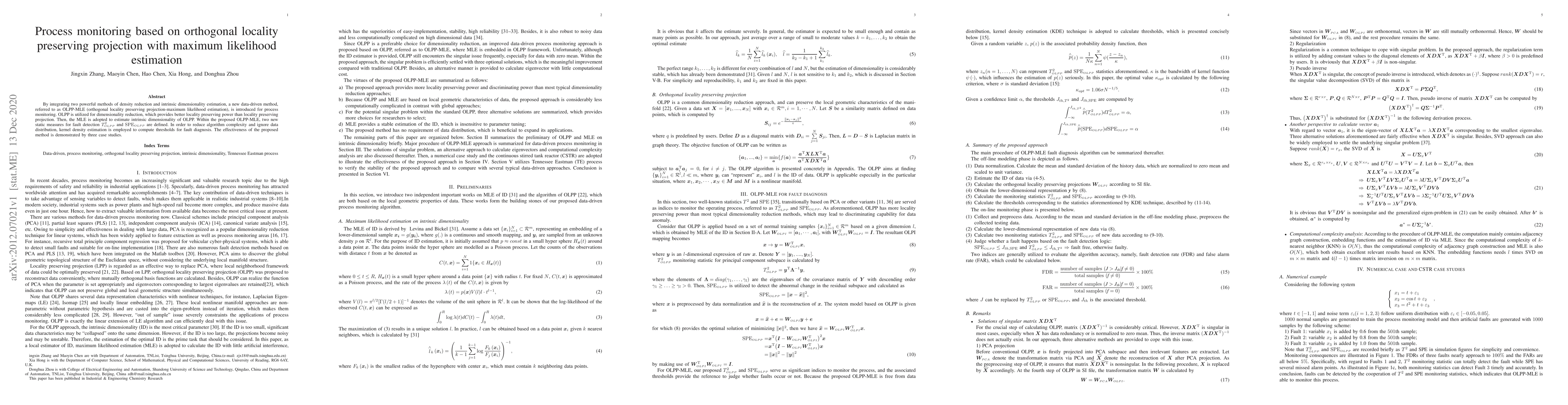 The paper introduces OLPP-MLE, a new method combining orthogonal locality preserving projection and maximum likelihood estimation for process monitoring, defining static measures for fault detection and demonstrating its effectiveness through case studies. The method uses kernel density estimation to simplify thresholds for fault diagnosis.
