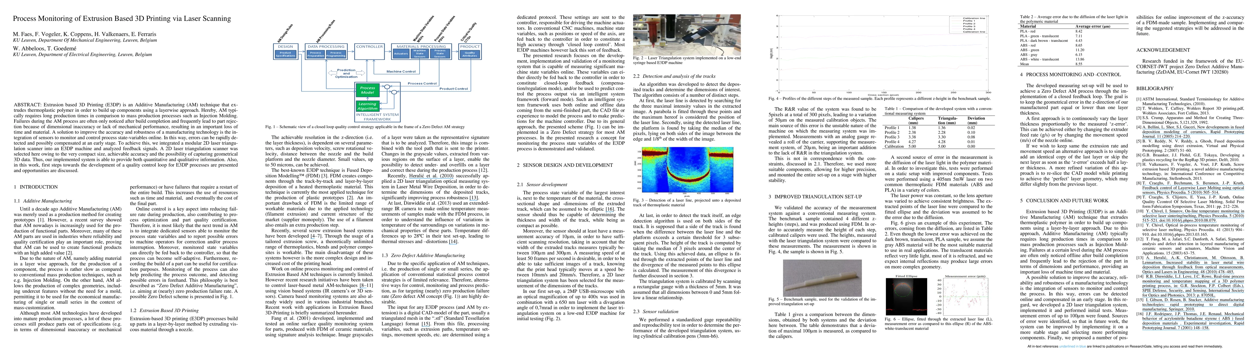 Extrusion based 3D Printing (E3DP) is an Additive Manufacturing (AM) technique that extrudes thermoplastic polymer in order to build up components using a layerwise approach. Hereby, AM typically requires long production times in comparison to mass production processes such as Injection Molding. Failures during the AM process are often only noticed after build completion and frequently lead to part rejection because of dimensional inaccuracy or lack of mechanical performance, resulting in an important loss of time and material. A solution to improve the accuracy and robustness of a manufacturing technology is the integration of sensors to monitor and control process state-variables online. In this way, errors can be rapidly detected and possibly compensated at an early stage. To achieve this, we integrated a modular 2D laser triangulation scanner into an E3DP machine and analyzed feedback signals. A 2D laser triangulation scanner was selected here owing to the very compact size, achievable accuracy and the possibility of capturing geometrical 3D data. Thus, our implemented system is able to provide both quantitative and qualitative information. Also, in this work, first steps towards the development of a quality control loop for E3DP processes are presented and opportunities are discussed.