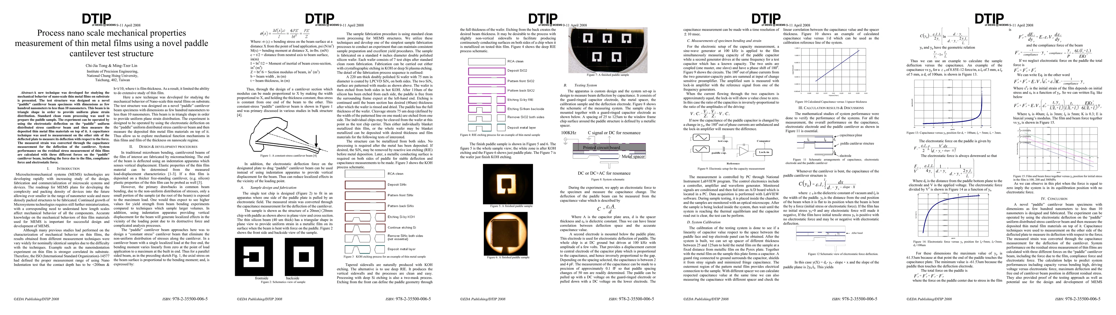 This paper introduces a novel paddle cantilever test structure for measuring the nanoscale mechanical properties of thin metal films. The triangular paddle design ensures uniform strain distribution, and a capacitance technique measures deflection to assess residual stress in the films under various forces.