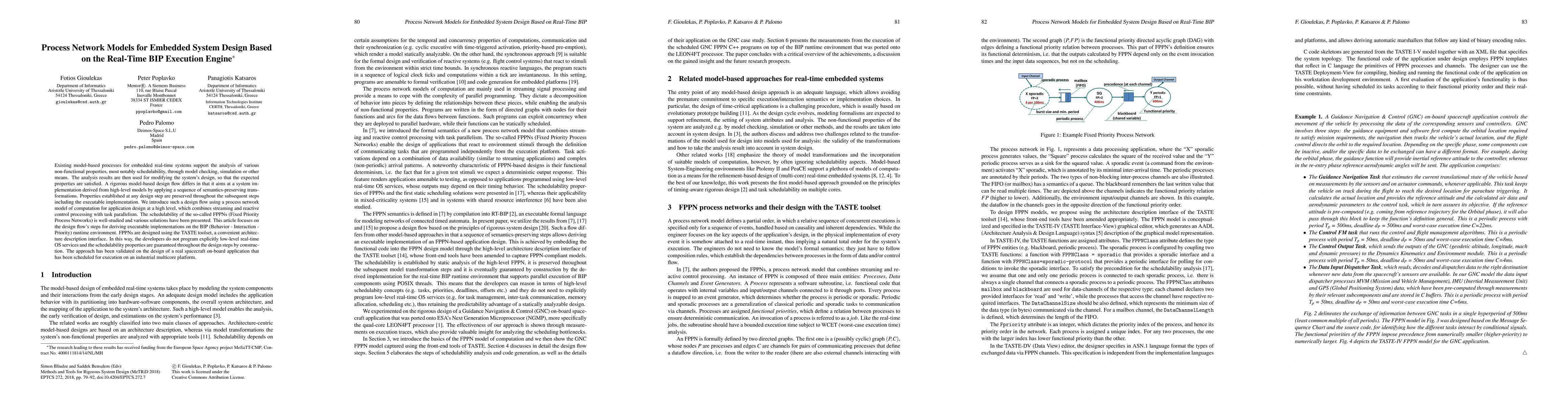 Existing model-based processes for embedded real-time systems support the analysis of various non-functional properties, most notably schedulability, through model checking, simulation or other means. The analysis results are then used for modifying the system's design, so that the expected properties are satisfied. A rigorous model-based design flow differs in that it aims at a system implementation derived from high-level models by applying a sequence of semantics-preserving transformations. Properties established at any design step are preserved throughout the subsequent steps including the executable implementation. We introduce such a design flow using a process network model of computation for application design at a high level, which combines streaming and reactive control processing with task parallelism. The schedulability of the so-called FPPNs (Fixed Priority Process Networks) is well-studied and various solutions have been presented. This article focuses on the design flow's steps for deriving executable implementations on the BIP (Behavior - Interaction - Priority) runtime environment. FPPNs are designed using the TASTE toolset, a convenient architecture description interface. In this way, the developers do not program explicitly low-level real-time OS services and the schedulability properties are guaranteed throughout the design steps by construction. The approach has been validated on the design of a real spacecraft on-board application that has been scheduled for execution on an industrial multicore platform.