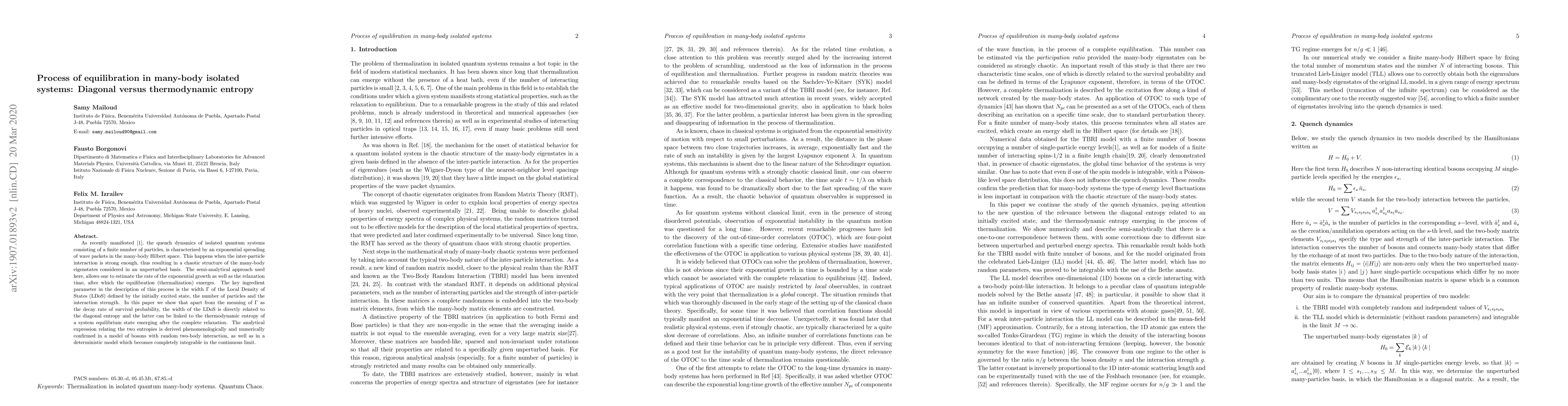 As recently manifested , the quench dynamics of isolated quantum systems consisting of a finite number of particles, is characterized by an exponential spreading of wave packets in the many-body Hilbert space. This happens when the inter-particle interaction is strong enough, thus resulting in a chaotic structure of the many-body eigenstates considered in an unperturbed basis. The semi-analytical approach used here, allows one to estimate the rate of the exponential growth as well as the relaxation time, after which the equilibration (thermalization) emerges. The key ingredient parameter in the description of this process is the width $\Gamma$ of the Local Density of States (LDoS) defined by the initially excited state, the number of particles and the interaction strength. In this paper we show that apart from the meaning of $\Gamma$ as the decay rate of survival probability, the width of the LDoS is directly related to the diagonal entropy and the latter can be linked to the thermodynamic entropy of a system equilibrium state emerging after the complete relaxation. The analytical expression relating the two entropies is derived phenomenologically and numerically confirmed in a model of bosons with random two-body interaction, as well as in a deterministic model which becomes completely integrable in the continuous limit.