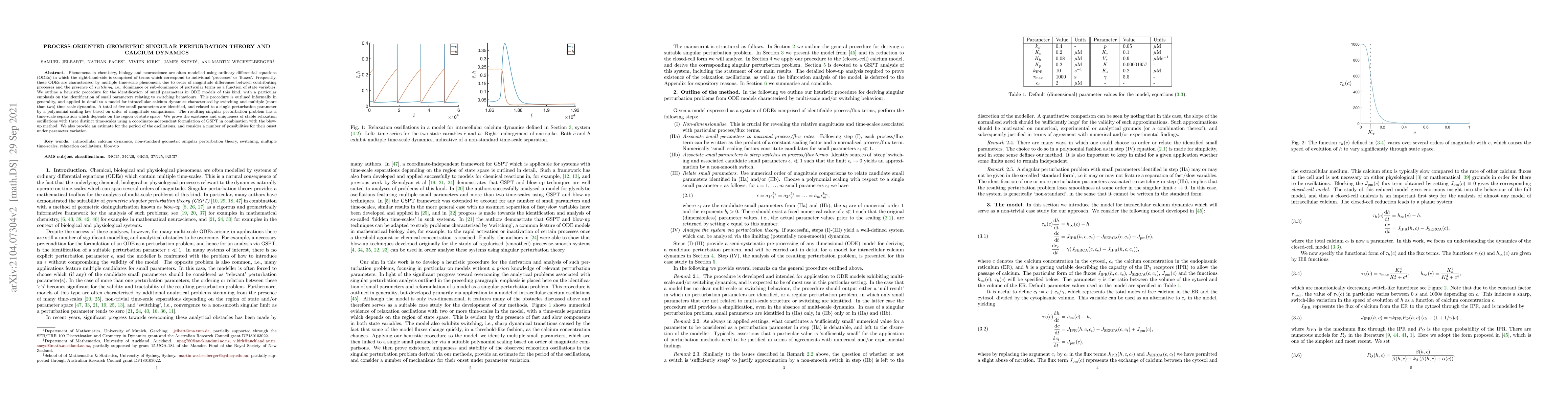 Phenomena in chemistry, biology and neuroscience are often modelled using ordinary differential equations (ODEs) in which the right-hand-side is comprised of terms which correspond to individual 'processes' or 'fluxes'. Frequently, these ODEs are characterised by multiple time-scale phenomena due to order of magnitude differences between contributing processes and the presence of switching, i.e., dominance or sub-dominance of particular terms as a function of state variables. We outline a heuristic procedure for the identification of small parameters in ODE models of this kind, with a particular emphasis on the identification of small parameters relating to switching behaviours. This procedure is outlined informally in generality, and applied in detail to a model for intracellular calcium dynamics characterised by switching and multiple (more than two) time-scale dynamics. A total of five small parameters are identified, and related to a single perturbation parameter by a polynomial scaling law based on order of magnitude comparisons. The resulting singular perturbation problem has a time-scale separation which depends on the region of state space. We prove the existence and uniqueness of stable relaxation oscillations with three distinct time-scales using a coordinate-independent formulation of GSPT in combination with the blow-up method. We also provide an estimate for the period of the oscillations, and consider a number of possibilities for their onset under parameter variation.