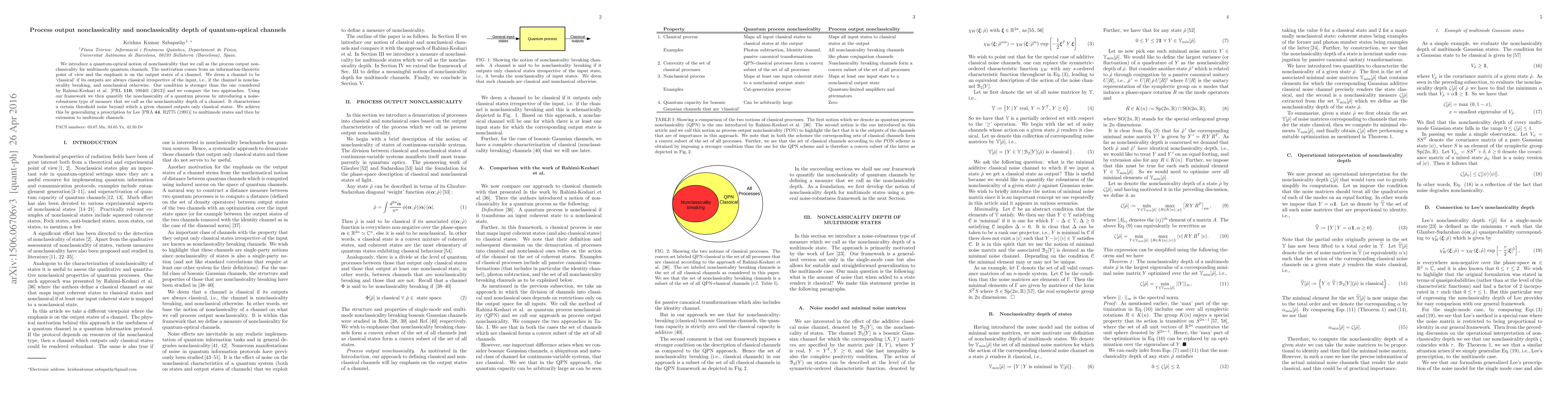 We introduce a quantum-optical notion of nonclassicality that we call as the process output nonclassicality for multimode quantum channels. The motivation comes from an information-theoretic point of view and the emphasis is on the output states of a channel. We deem a channel to be `classical' if its outputs are always classical irrespective of the input, i.e., if the channel is nonclassicality breaking, and nonclassical otherwise. Our condition is stronger than the one considered by Rahimi-Keshari et al. [PRL {\bf 110}, 160401 (2013)] and we compare the two approaches. Using our framework we then quantify the nonclassicality of a quantum process by introducing a noise-robustness type of measure that we call as the nonclassicality depth of a channel. It characterizes a certain threshold noise beyond which a given channel outputs only classical states. We achieve this by generalizing a prescription by Lee [PRA {\bf 44}, R2775 (1991)] to multimode states and then by extension to multimode channels.