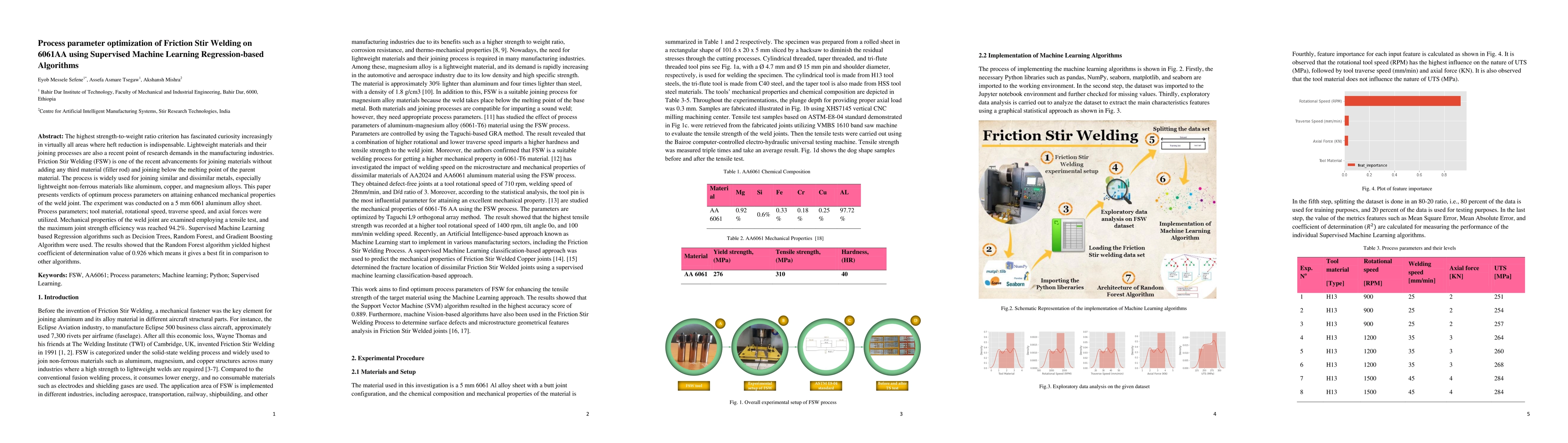 This paper optimizes process parameters for Friction Stir Welding (FSW) on 6061 aluminum alloy using supervised machine learning regression algorithms. The Random Forest algorithm achieved the highest coefficient of determination (0.926), indicating superior predictive accuracy for optimizing mechanical properties.