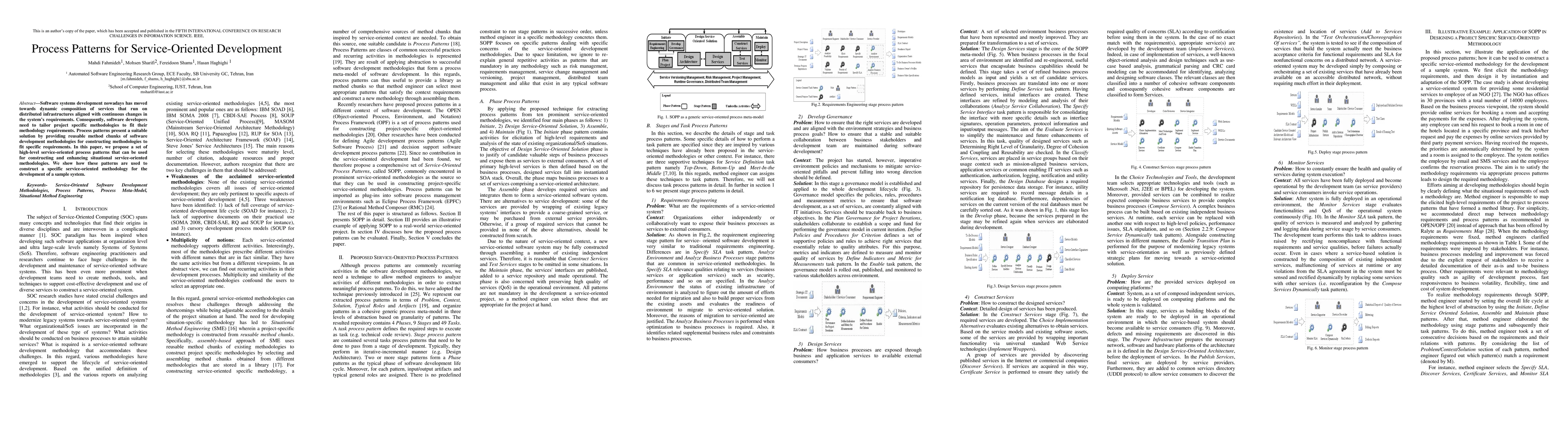Software systems development nowadays has moved towards dynamic composition of services that run on distributed infrastructures aligned with continuous changes in the system requirements. Consequently, software developers need to tailor project specific methodologies to fit their methodology requirements. Process patterns present a suitable solution by providing reusable method chunks of software development methodologies for constructing methodologies to fit specific requirements. In this paper, we propose a set of high-level service-oriented process patterns that can be used for constructing and enhancing situational service-oriented methodologies. We show how these patterns are used to construct a specific service-oriented methodology for the development of a sample system. Keywords. Service-Oriented Software Development Methodologies, Process Patterns, Process Meta-Model, Situational Method Engineering