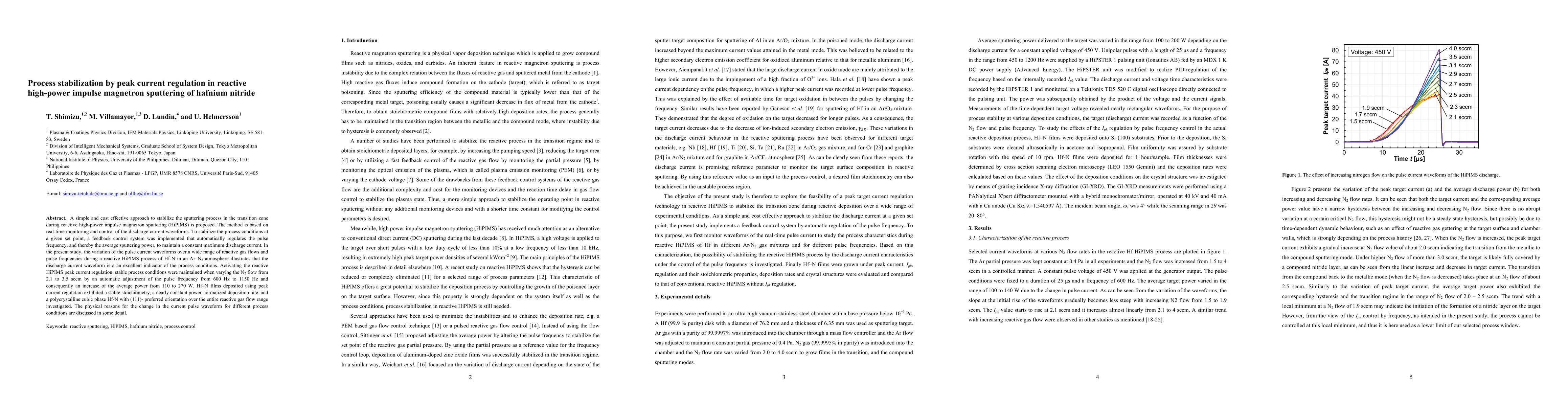 This paper proposes a method to stabilize the sputtering process in reactive high-power impulse magnetron sputtering (HiPIMS) by regulating peak current, which stabilizes process conditions and maintains film stoichiometry. The feedback control system adjusts pulse frequency to keep the maximum discharge current constant, resulting in stable Hf-N films over varying gas flows.