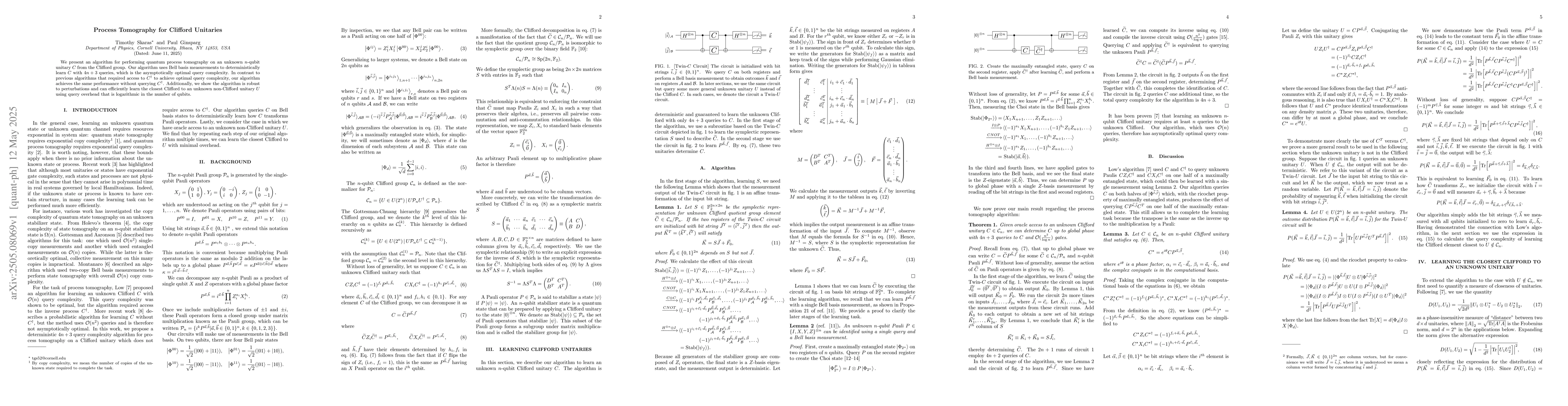 The paper presents an algorithm for quantum process tomography on unknown n-qubit Clifford unitaries using Bell basis measurements, achieving deterministic learning with 4n + 3 queries, and demonstrating robustness to perturbations.