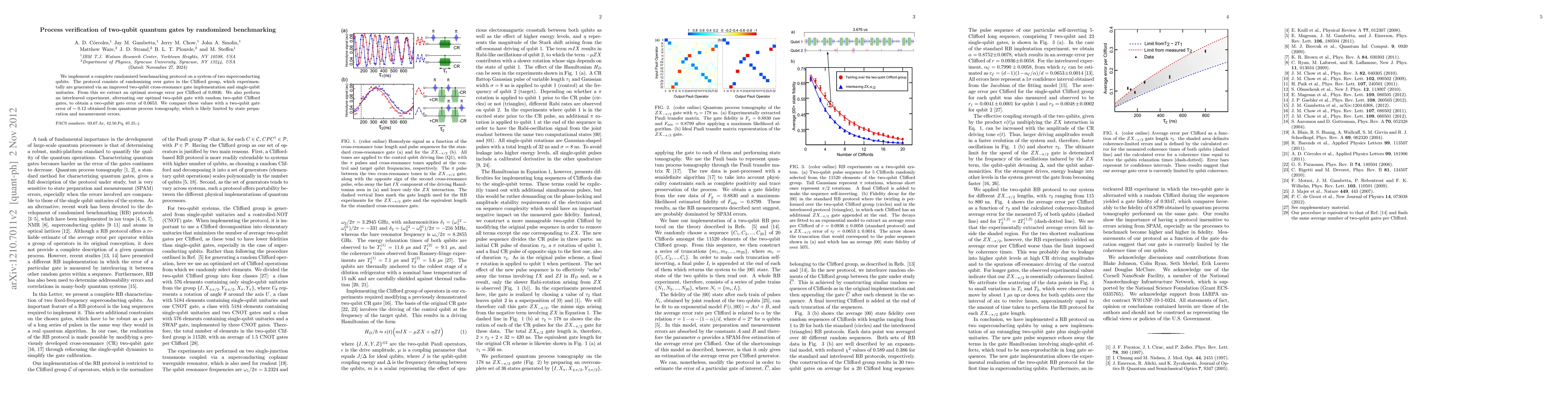 This paper details a randomized benchmarking protocol to verify the performance of two-qubit quantum gates on superconducting qubits, achieving an average error per Clifford gate of 0.0936 and a two-qubit gate error of 0.0653, which is lower than the 0.12 error obtained via quantum process tomography.