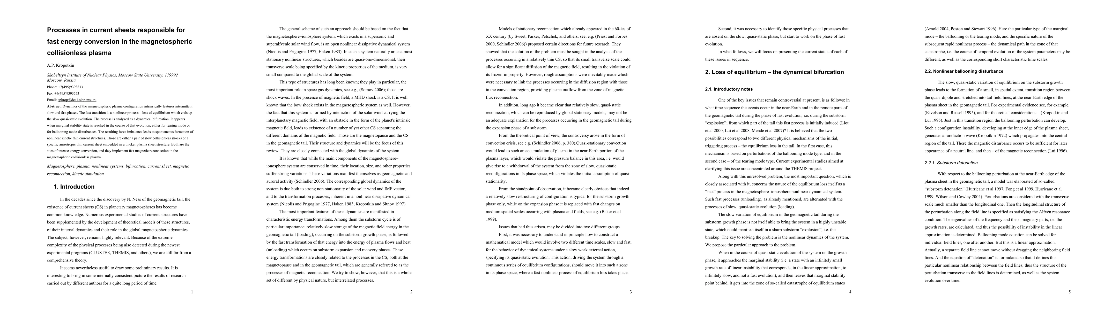 This paper investigates the dynamics of fast energy conversion in magnetospheric collisionless plasma, focusing on the nonlinear processes that lead to the formation of thin current structures and collisionless shocks. These structures facilitate rapid magnetic reconnection, driving the transition from slow quasi-static evolution to fast, dynamic phases.