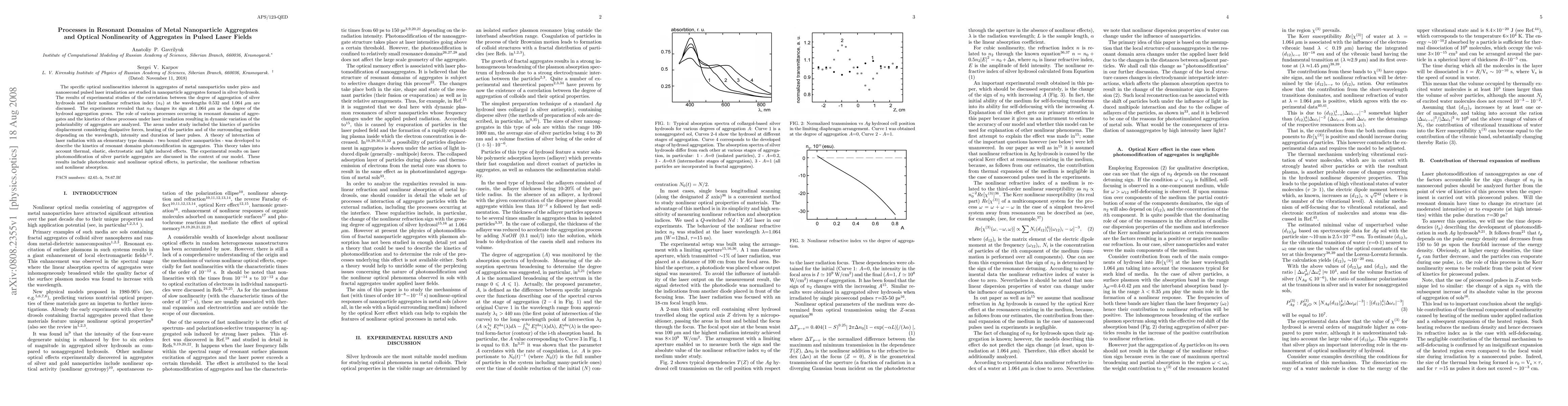 The specific optical nonlinearities inherent in aggregates of metal nanoparticles under pico- and nanosecond pulsed laser irradiation are studied in nanoparticle aggregates formed in silver hydrosols. The results of experimental studies of the correlation between the degree of aggregation of silver hydrosols and their nonlinear refraction index at the wavelengths 0.532 and 1.064 microns are discussed. The experiments revealed that nonlinear refraction index changes its sign at 1.064 microns as the degree of the hydrosol aggregation grows. The role of various processes occurring in resonant domains of aggregates and the kinetics of these processes under laser irradiation resulting in dynamic variation of the polarizability of aggregates are analyzed. The areas under study included the kinetics of particles displacement considering dissipative forces, heating of the particles and of the surrounding medium depending on the wavelength, intensity and duration of laser pulses. A theory of interaction of laser radiation with an elementary type domain - two bound silver nanoparticles - was developed to describe the kinetics of resonant domains photomodification in aggregates. This theory takes into account thermal, elastic, electrostatic and light induced effects. The experimental results on laser photomodification of silver particle aggregates are discussed in the context of our model. These results include photochromic and nonlinear optical effects, in particular, the nonlinear refraction and nonlinear absorption.