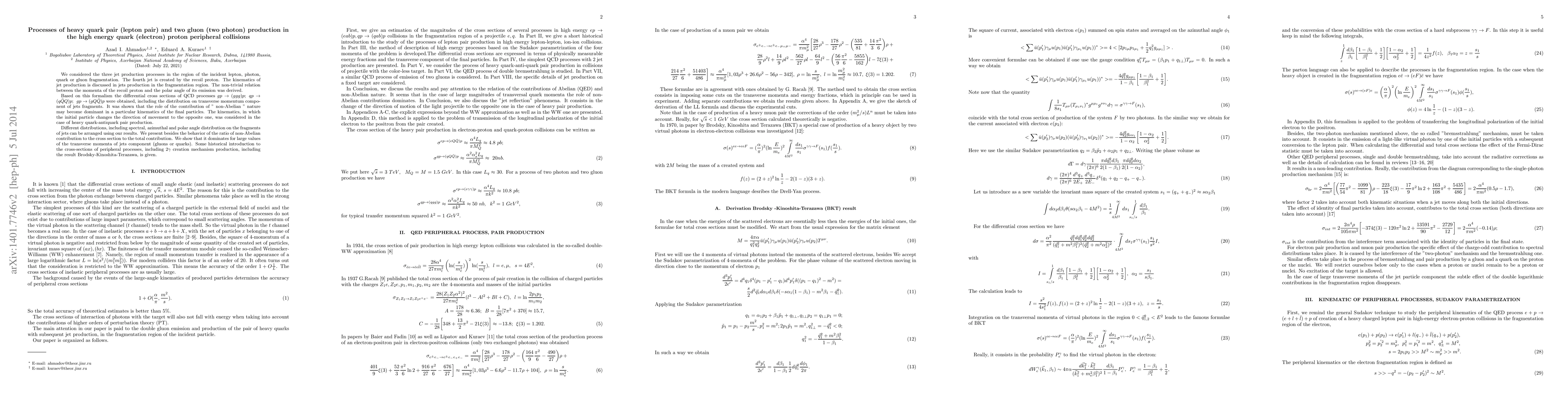 We considered the three jet production processes in the region of the incident lepton, photon, quark or gluon fragmentation. The fourth jet is created by the recoil proton. The kinematics of jet production is discussed in jets production in the fragmentation region. The non-trivial relation between the momenta of the recoil proton and the polar angle of its emission was derived. Based on this formalism the differential cross sections of QCD processes $gp \to (ggg) p; \,\,\,qp \to (q \bar{Q} Q) p; \,\,\, gp \to (g Q \bar{Q})p$ were obtained, including the distribution on transverse momentum component of jets fragments. It was shown that the role of the contribution of "non-Abelian" nature may become dominant in a particular kinematics of the final particles. The kinematics, in which the initial particle changes the direction of movement to the opposite one, was considered in the case of heavy quark-antiquark pair production. Different distributions, including spectral, azimuthal and polar angle distribution on the fragments of jets can be arranged using our results. We present besides the behavior of the ratio of non-Abelian contribution to the cross section to the total contribution. We show that it dominates for large values of the transverse momenta of jets component (gluons or quarks). Some historical introduction to the cross-sections of peripheral processes, including 2$\gamma$ creation mechanism production, including the result Brodsky-Kinoshita-Terazawa, is given.
